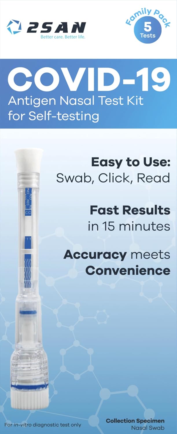 The 2San COVID-19 Pen Test offers a simple solution for at-home testing. With results available in just 15 minutes, this rapid nasal swab test is designed for ease of use. Each pack contains five tests, making it convenient for multiple uses or family testing. The test is clinically accurate, ensuring reliable results to help you make informed decisions about your health.