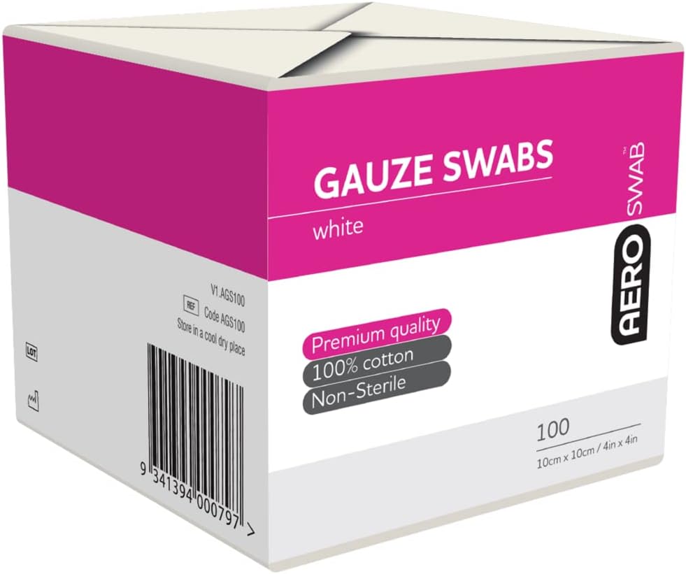 AEROSWAB Non‑Sterile White Gauze Swab, first aid absorbent 100% cotton multi‑ply gauze for cleansing and preparation,8 ply, 10 cm x 10 cm, pack of 100