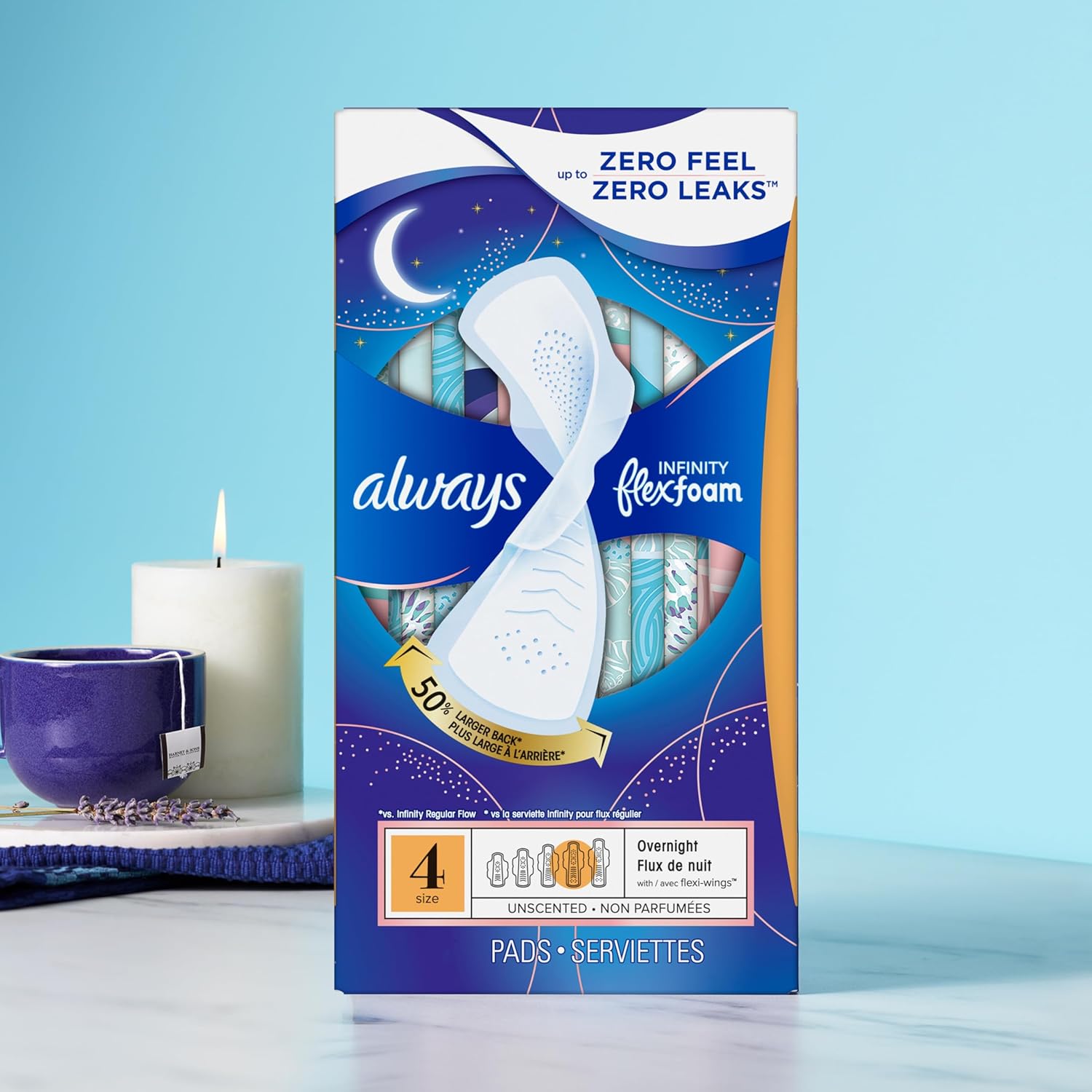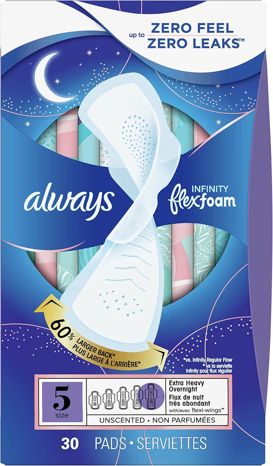Always Infinity Feminine Pads are designed for women seeking reliable overnight protection. These pads feature FlexFoam technology, which makes them incredibly thin and flexible, allowing for comfortable movement. With a breathable top layer, they help keep you feeling fresh throughout the night. The pads are unscented, making them suitable for sensitive skin. Key features include: