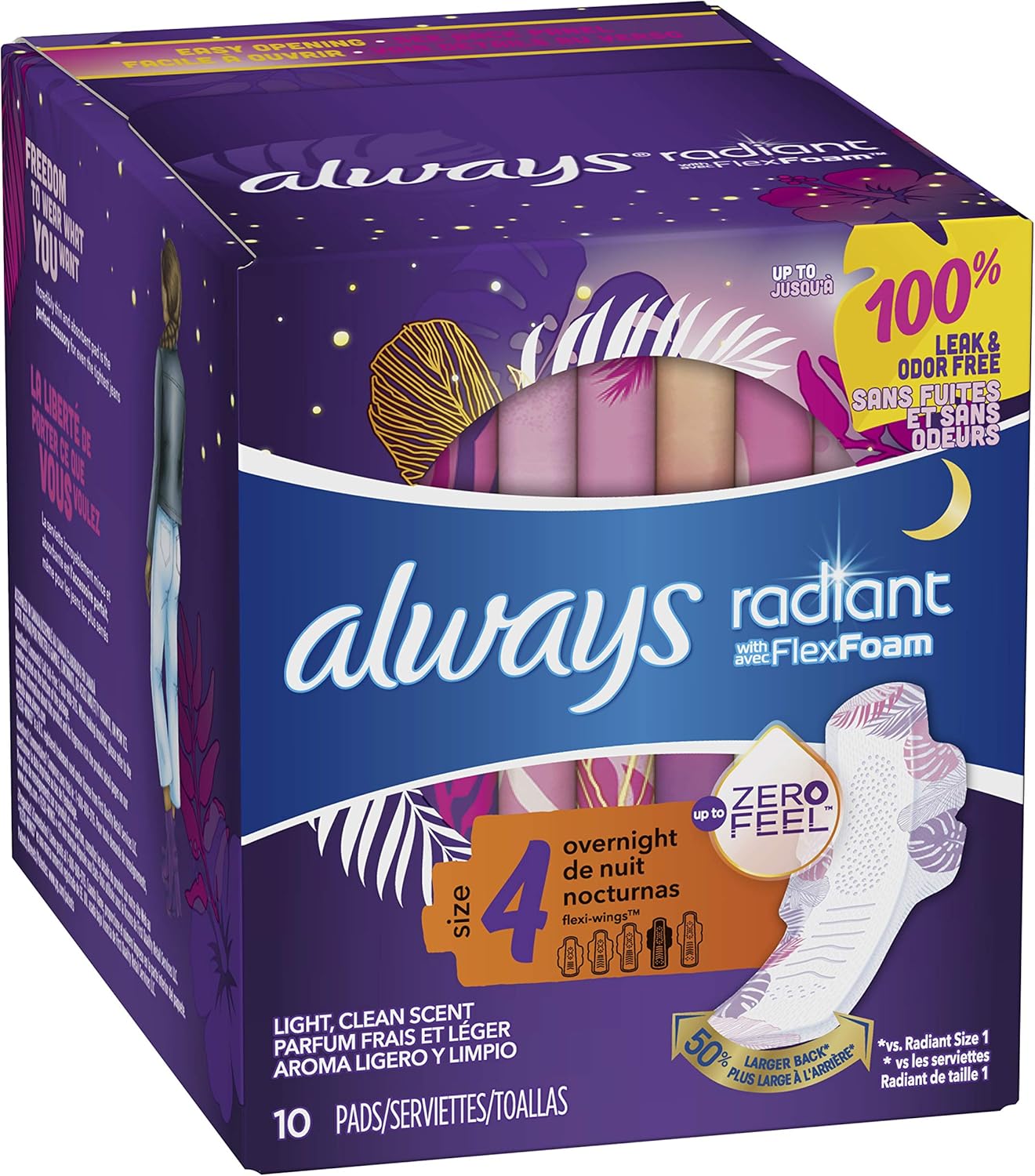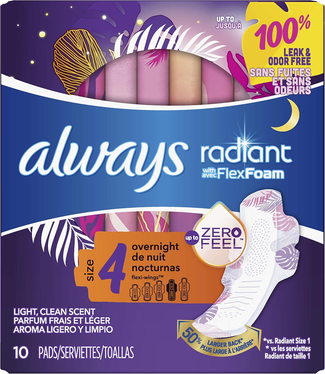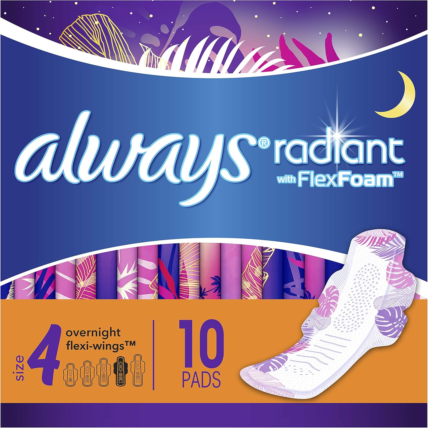 ALWAYS Radiant, Size 4, Overnight Sanitary Pads with Wings, Scented, 10Count, (Pack of 10)