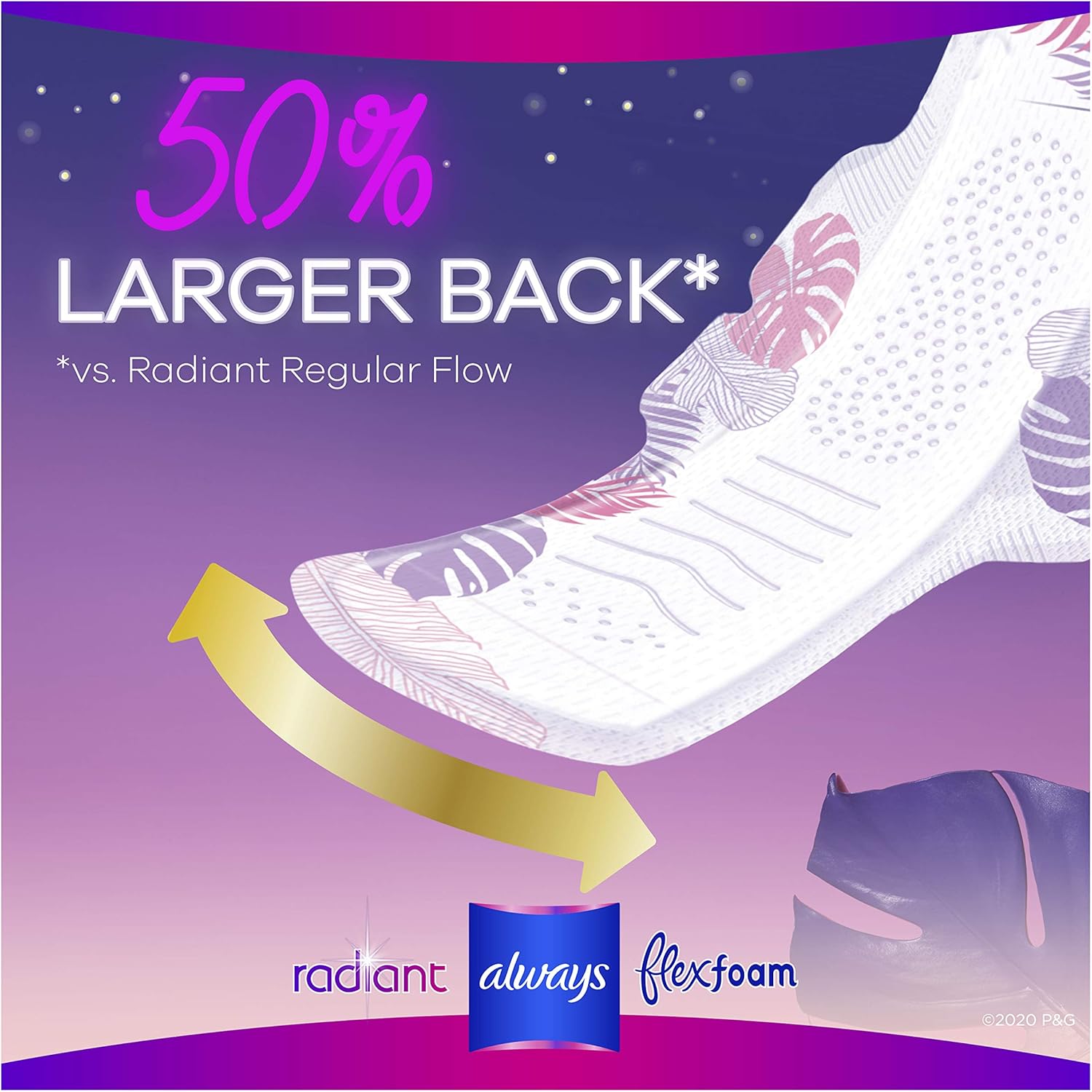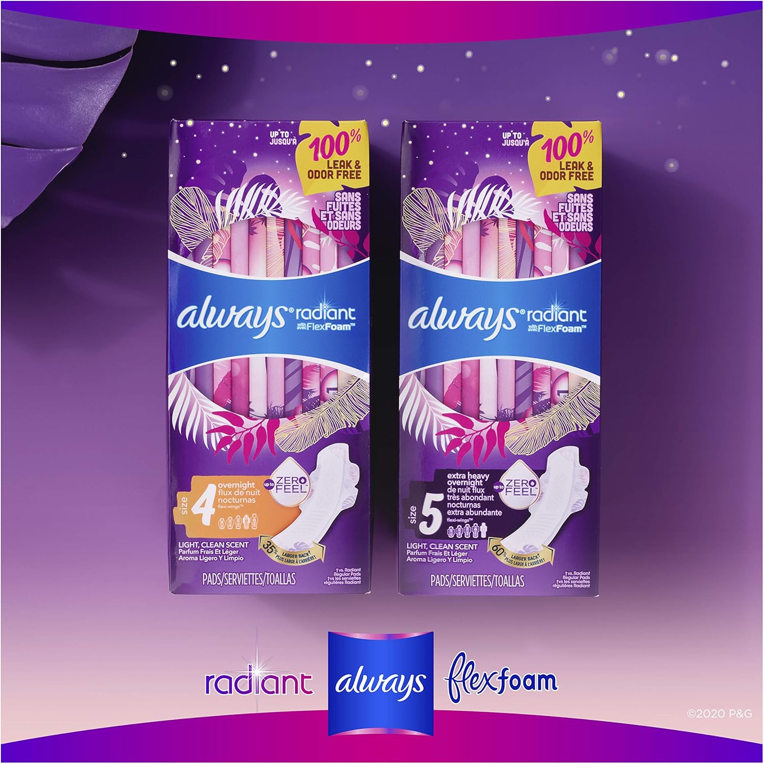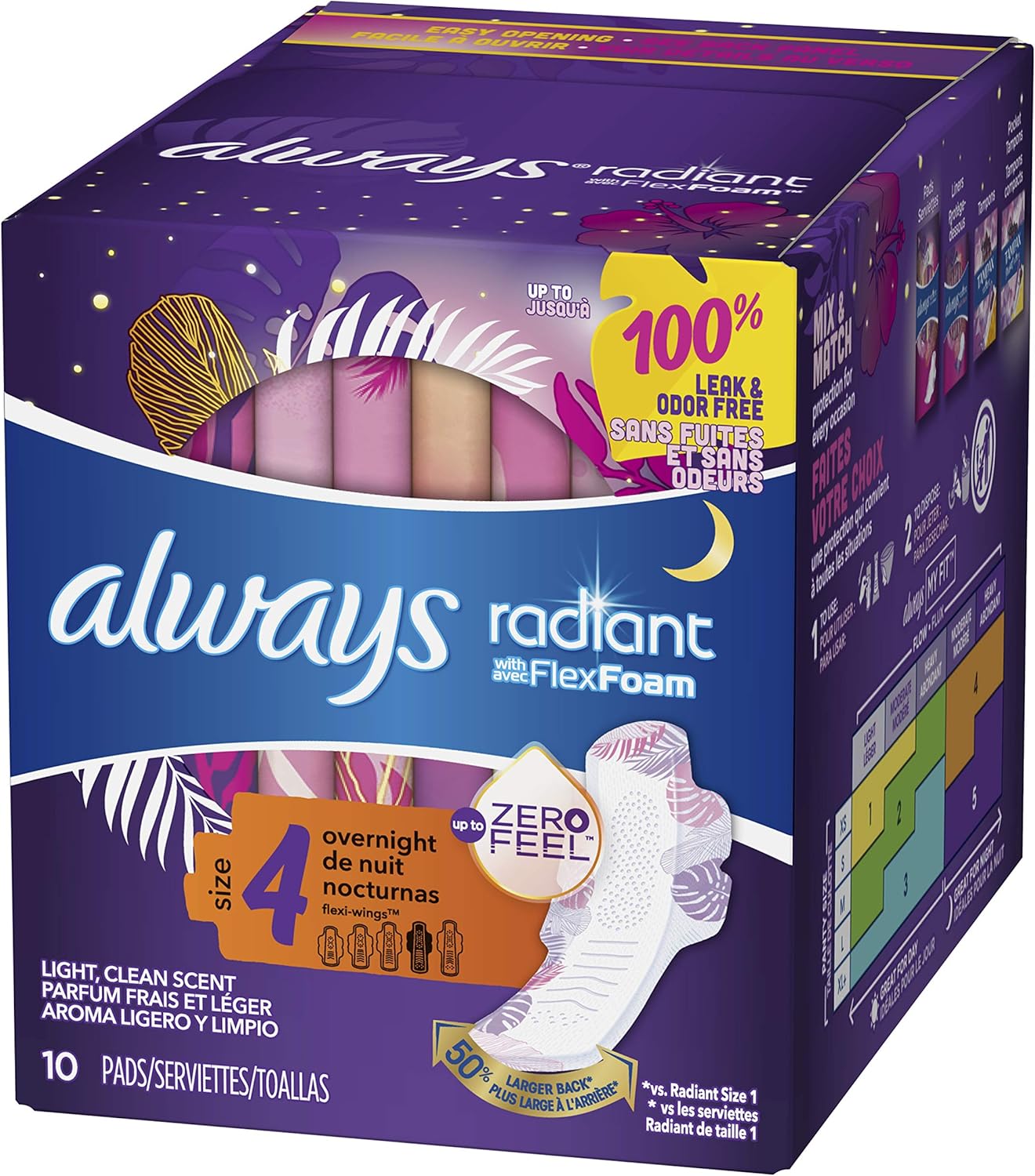 ALWAYS Radiant, Size 4, Overnight Sanitary Pads with Wings, Scented, 10Count, (Pack of 10)