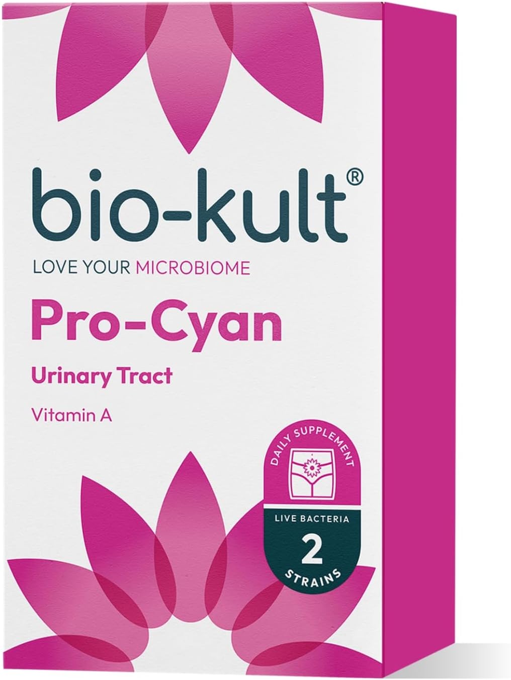 Bio-Kult Pro-Cyan is a triple action formulation designed to target the urinary tract, containing two probiotic strains and complemented with cranberry extract and vitamin A.
