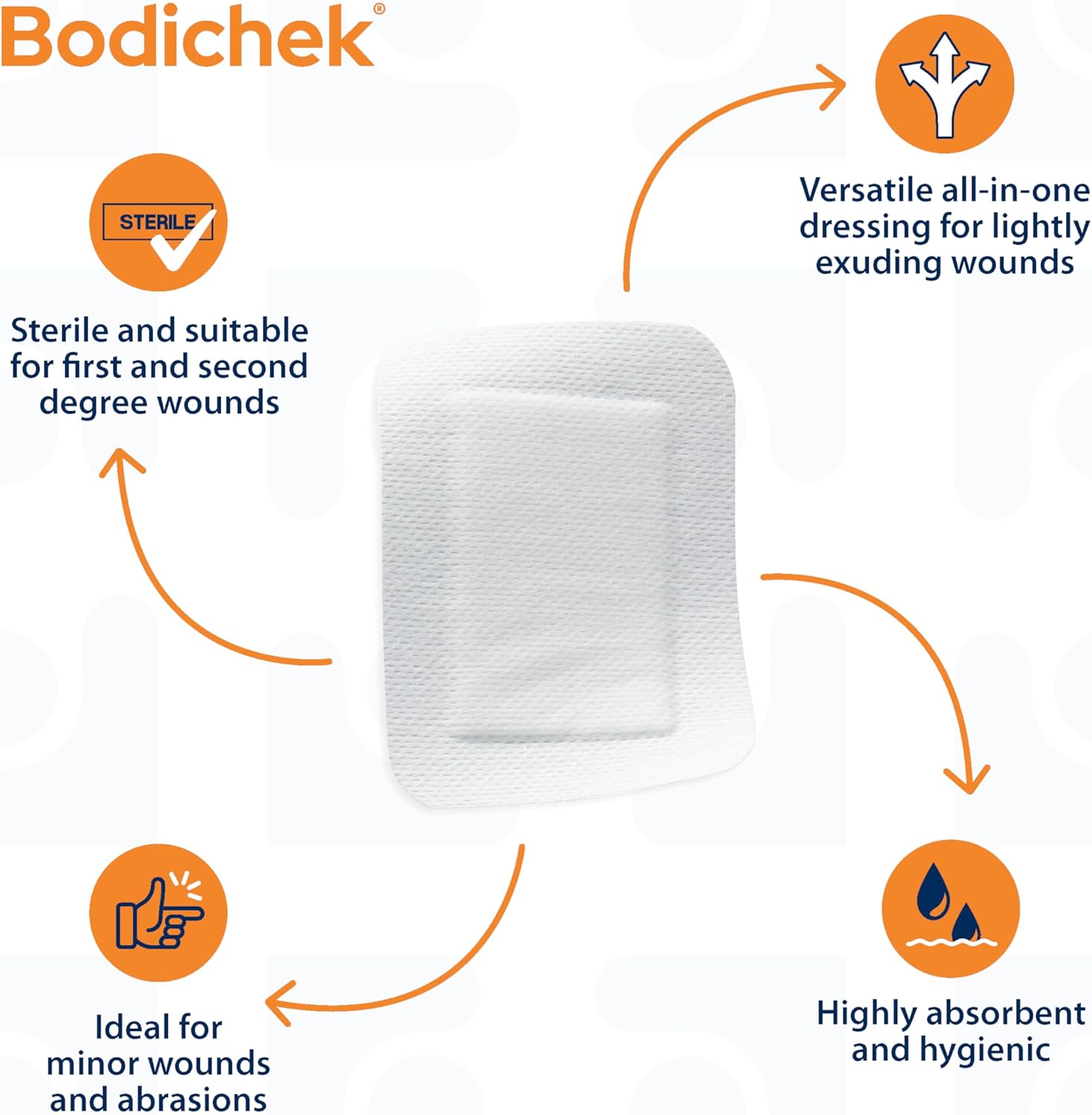 Bodichek Non-Woven Island Dressings are designed for effective wound care, suitable for light to medium exuding wounds. These dressings are ideal for treating minor cuts, grazes, abrasions, and first and second-degree burns. Their flexible and soft fabric conforms easily to the body, providing comfort during use. Additionally, they feature excellent breathing properties and a light stretch, allowing them to adhere well to various body areas.