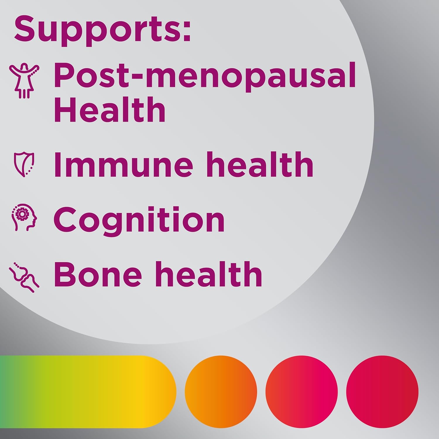 - Addresses post-menopausal health needs with higher levels of iron and calcium.