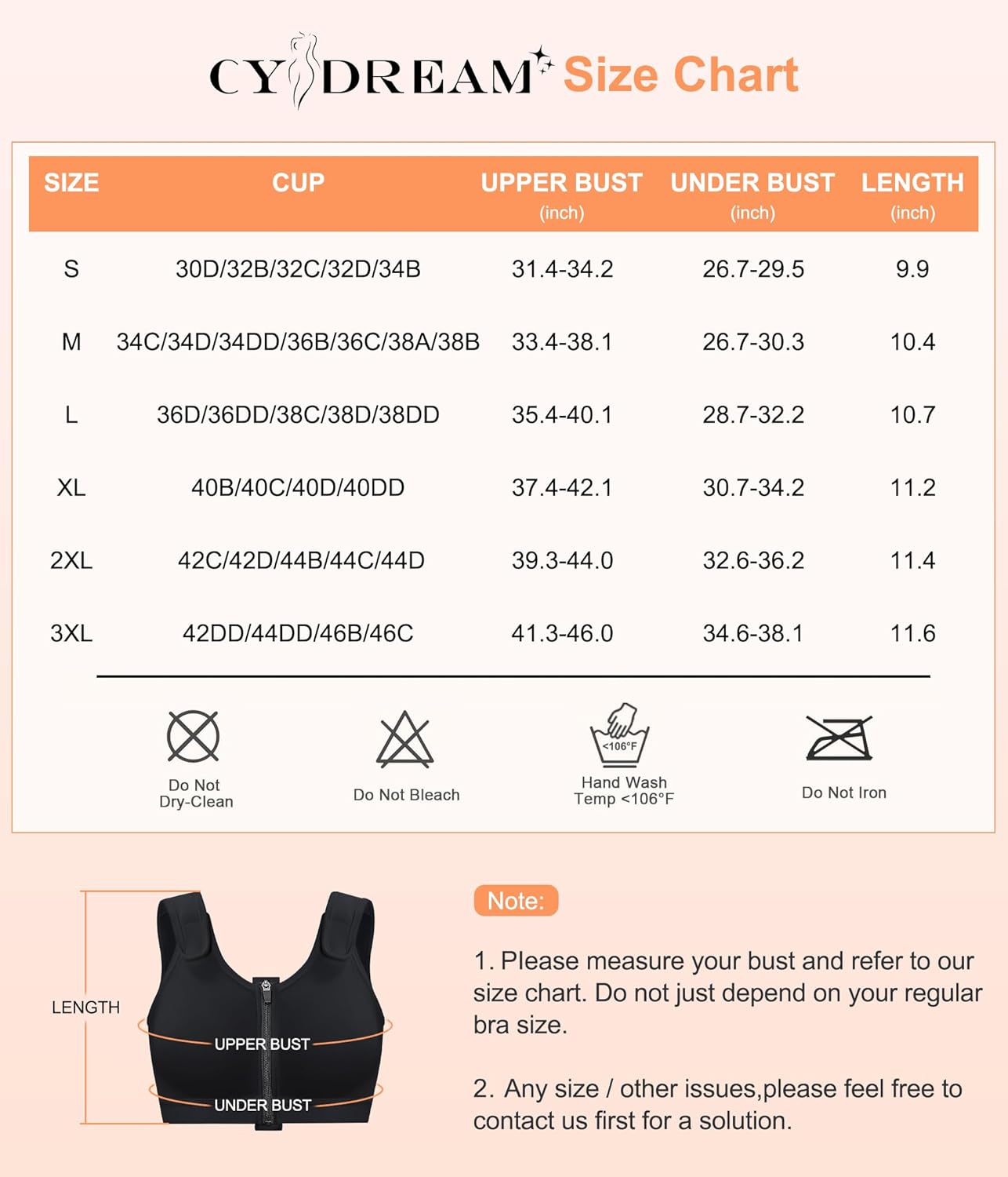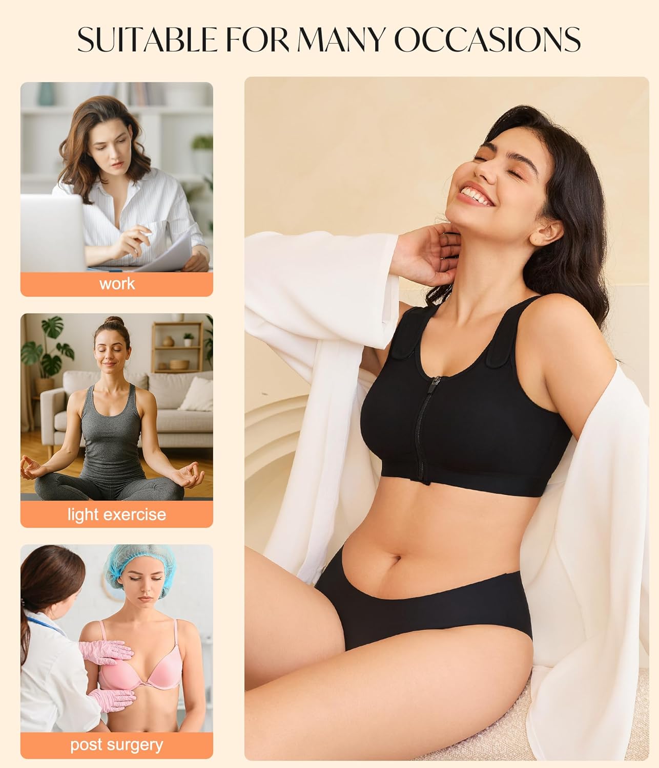 The CYDREAM Zip Front Closure Wireless Bra is designed for women post-surgery, providing compression, full coverage, and support for breast posture correction.