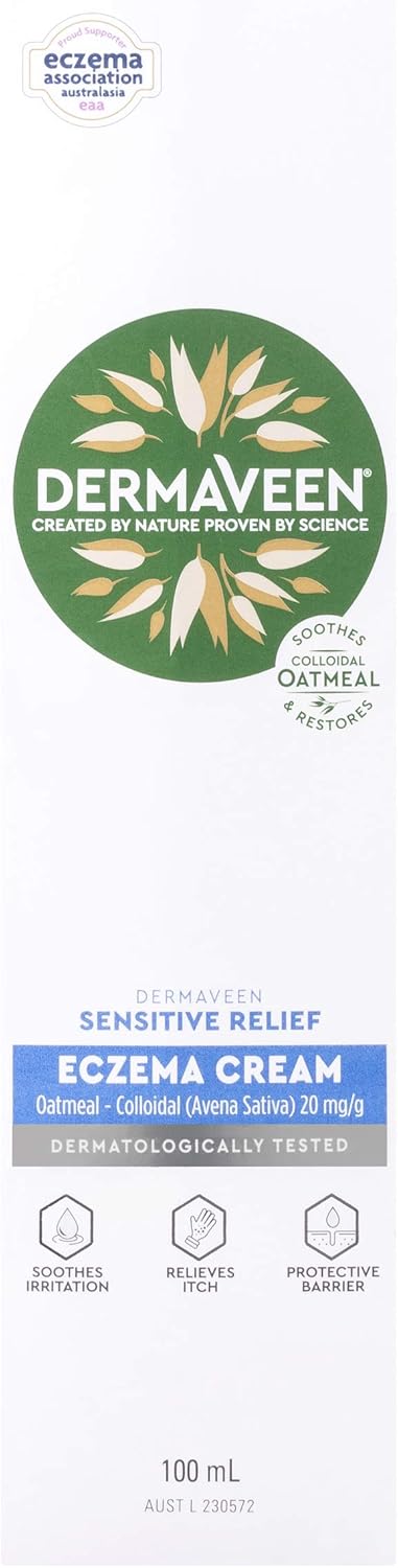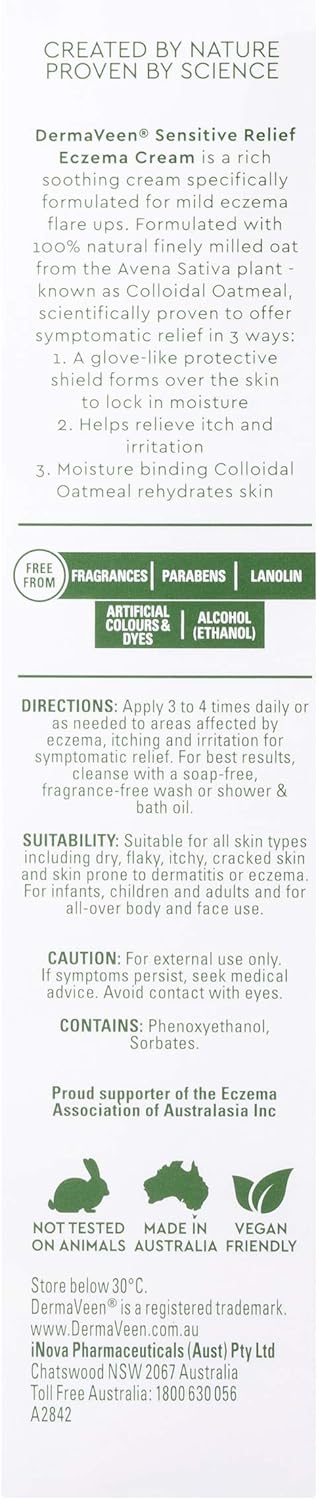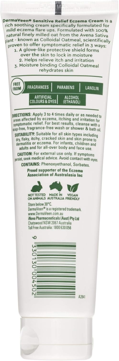 DermaVeen Sensitive Relief Eczema Cream 100mL with colloidal oatmeal that soothes and restores skin | Soothes irritation, relieves itch, forms protective barrier for skin | Free from fragrances, parabens, Lanolin, artificial colours & dyes, alcohol (ethanol)