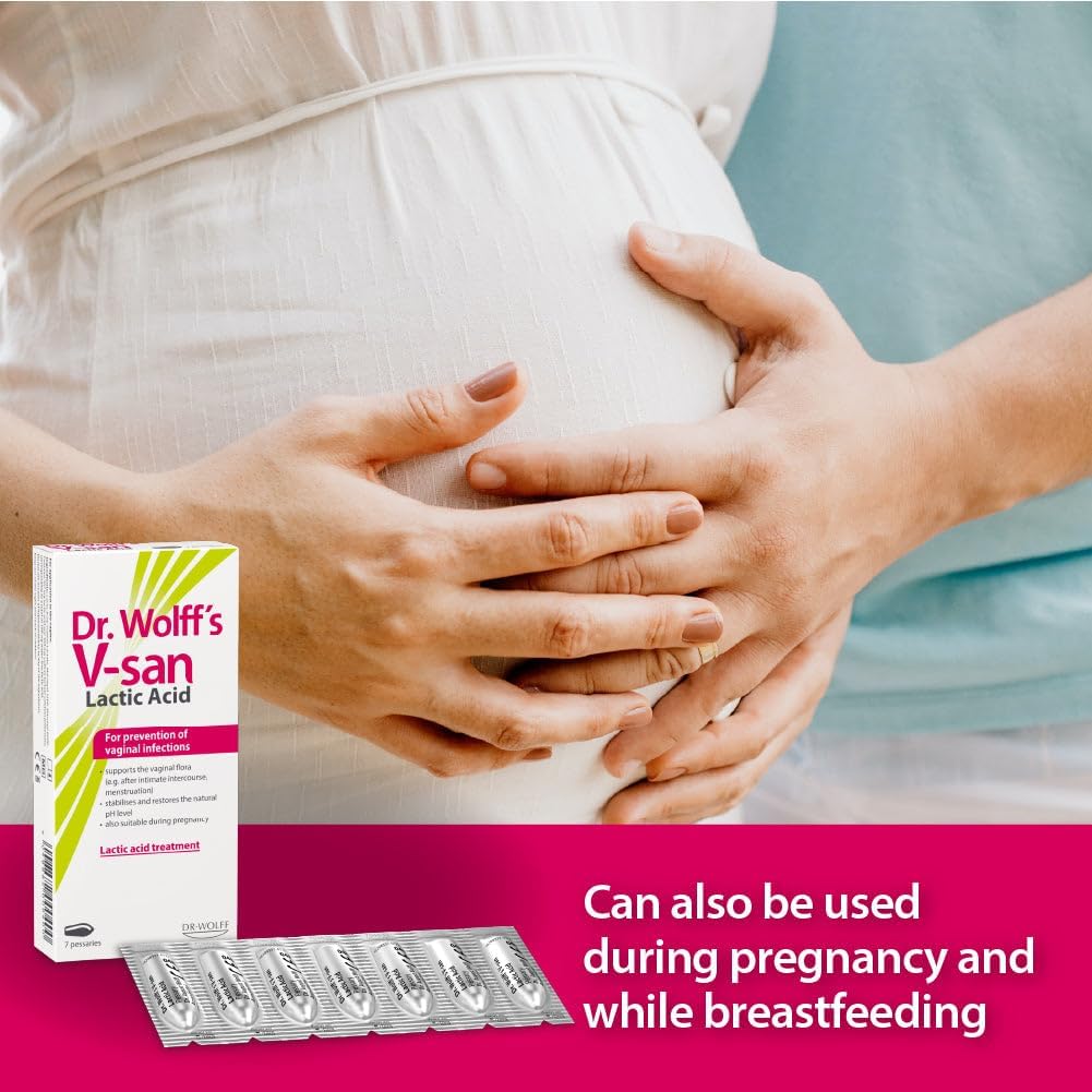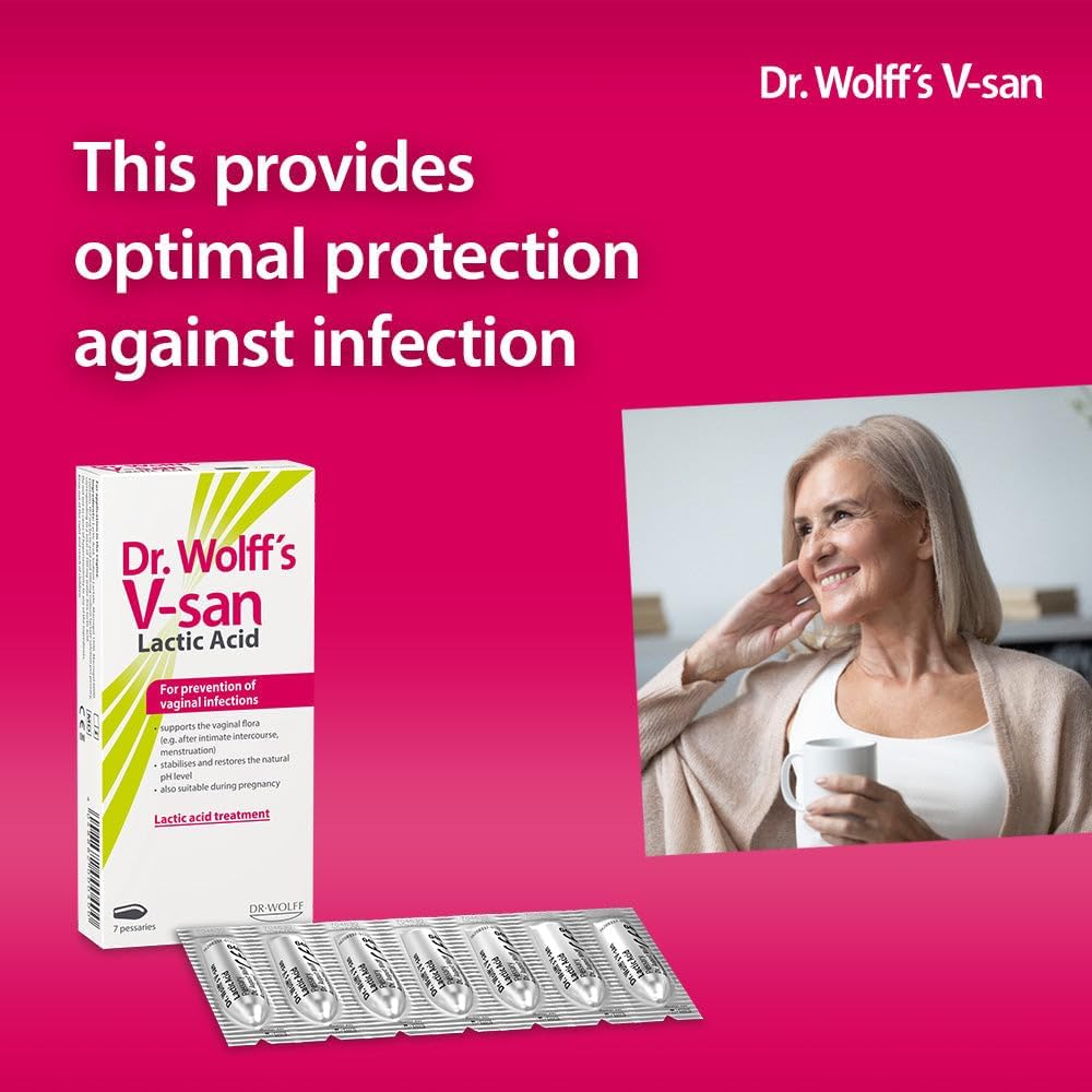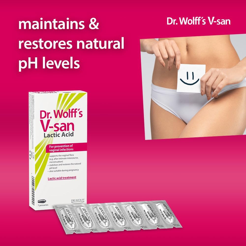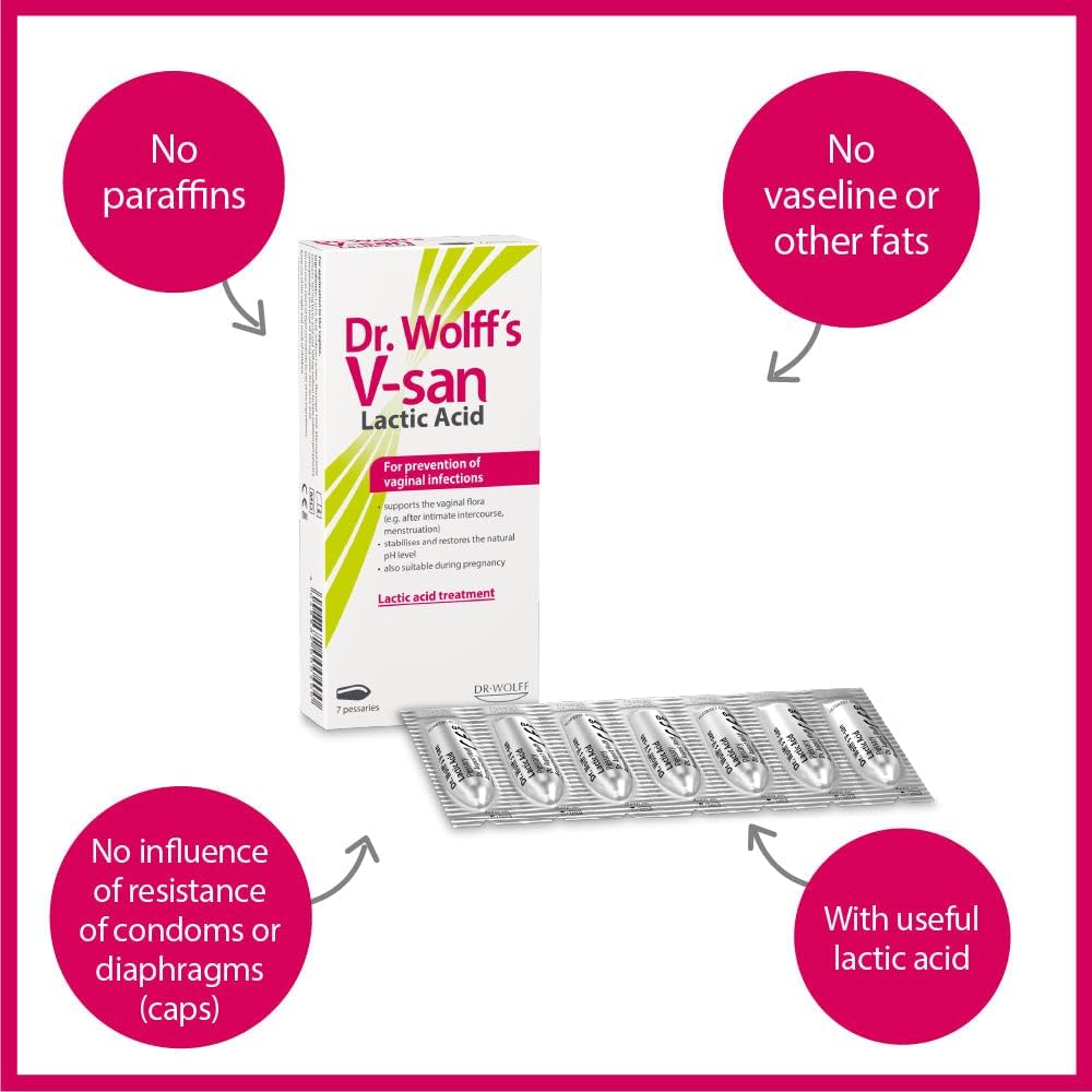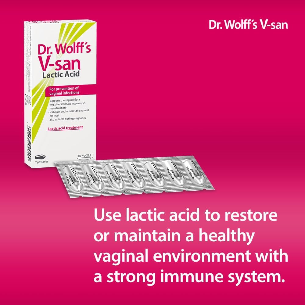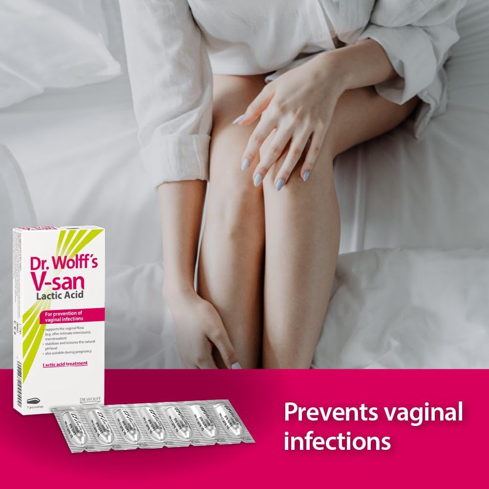Dr. Wolff’s V-san Lactic Acid for Prevention of Vaginal Infections 7 pcs | Restores Vaginal pH | Restore natural Vaginal health | Prevent reoccuring vaginal infections | Hormone-Free | Safe to use with Condoms