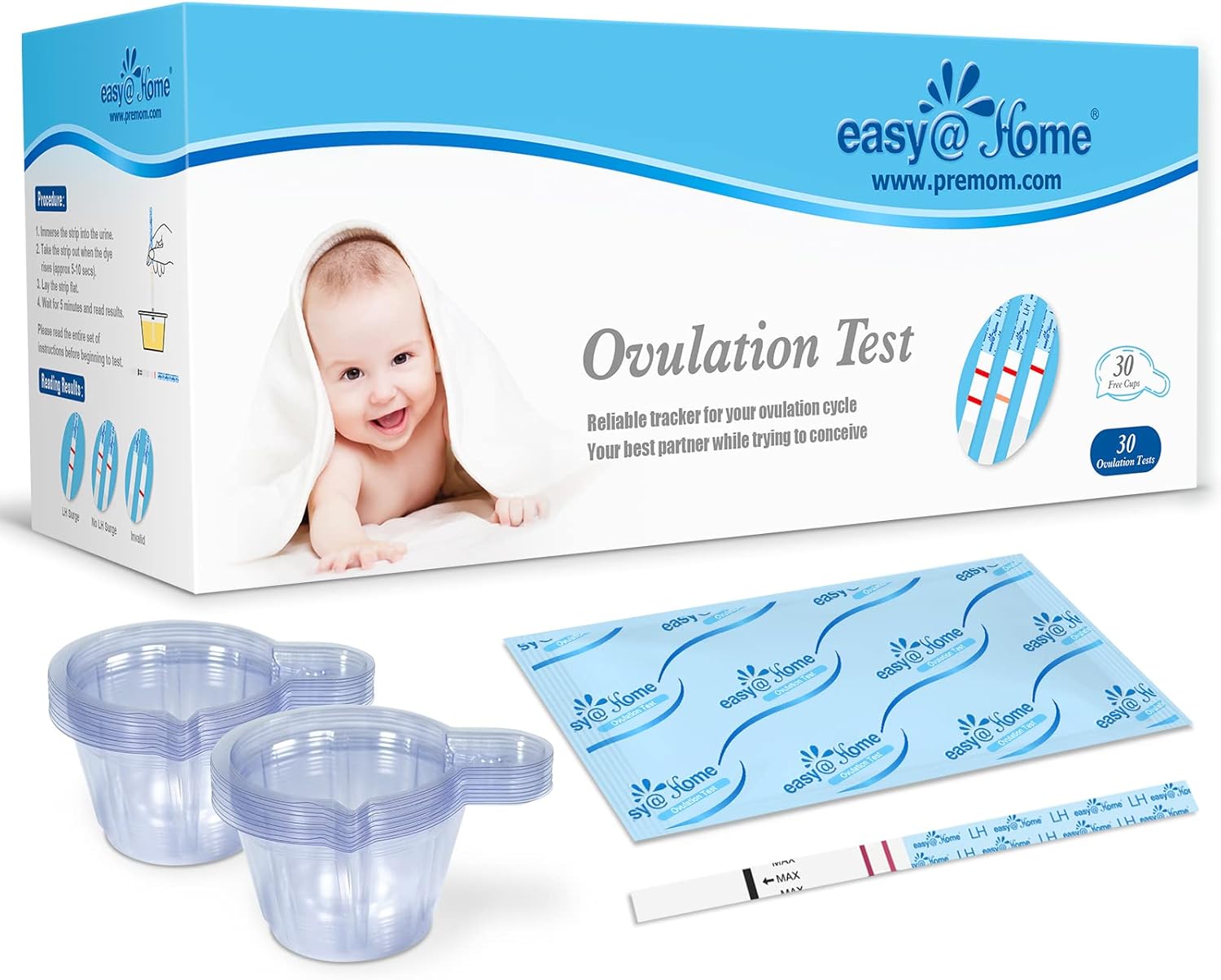 Easy@Home Ovulation Test Strips: Accurate 30 LH Ovulation Predictor Kit – Fertility Tests for Women – Powered by Premom Ovulation Tracker App | 30 LH + 30 Urine Cups