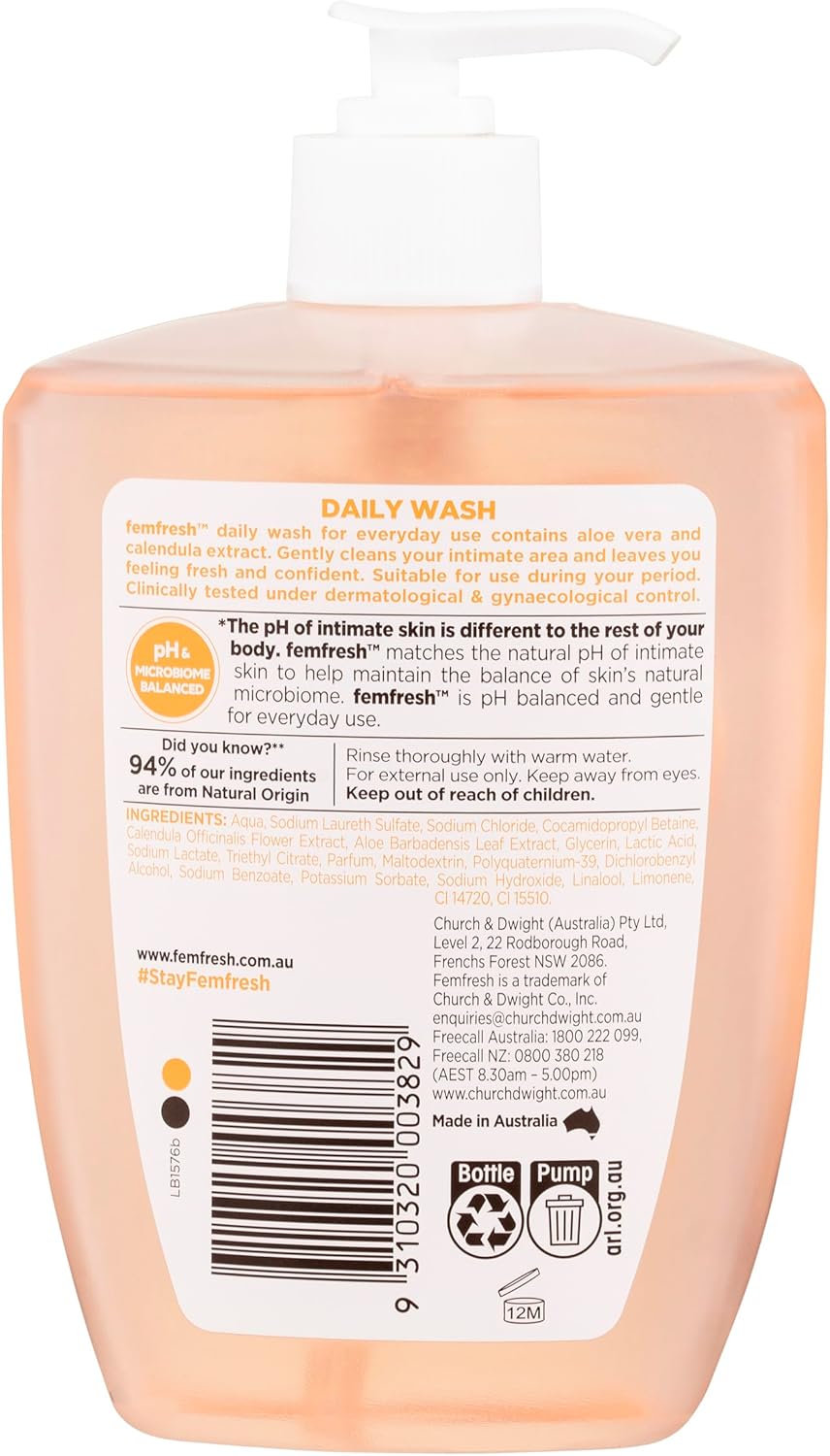 Femfresh Daily Intimate Wash is designed to maintain the natural pH balance and microbiome of intimate areas. This gentle wash is enriched with aloe vera and calendula extracts, making it suitable for daily use. It is formulated with 94% natural origin ingredients, ensuring a mild and hypoallergenic experience. The soap-free formula helps to cleanse without irritation, providing a refreshing feeling throughout the day.