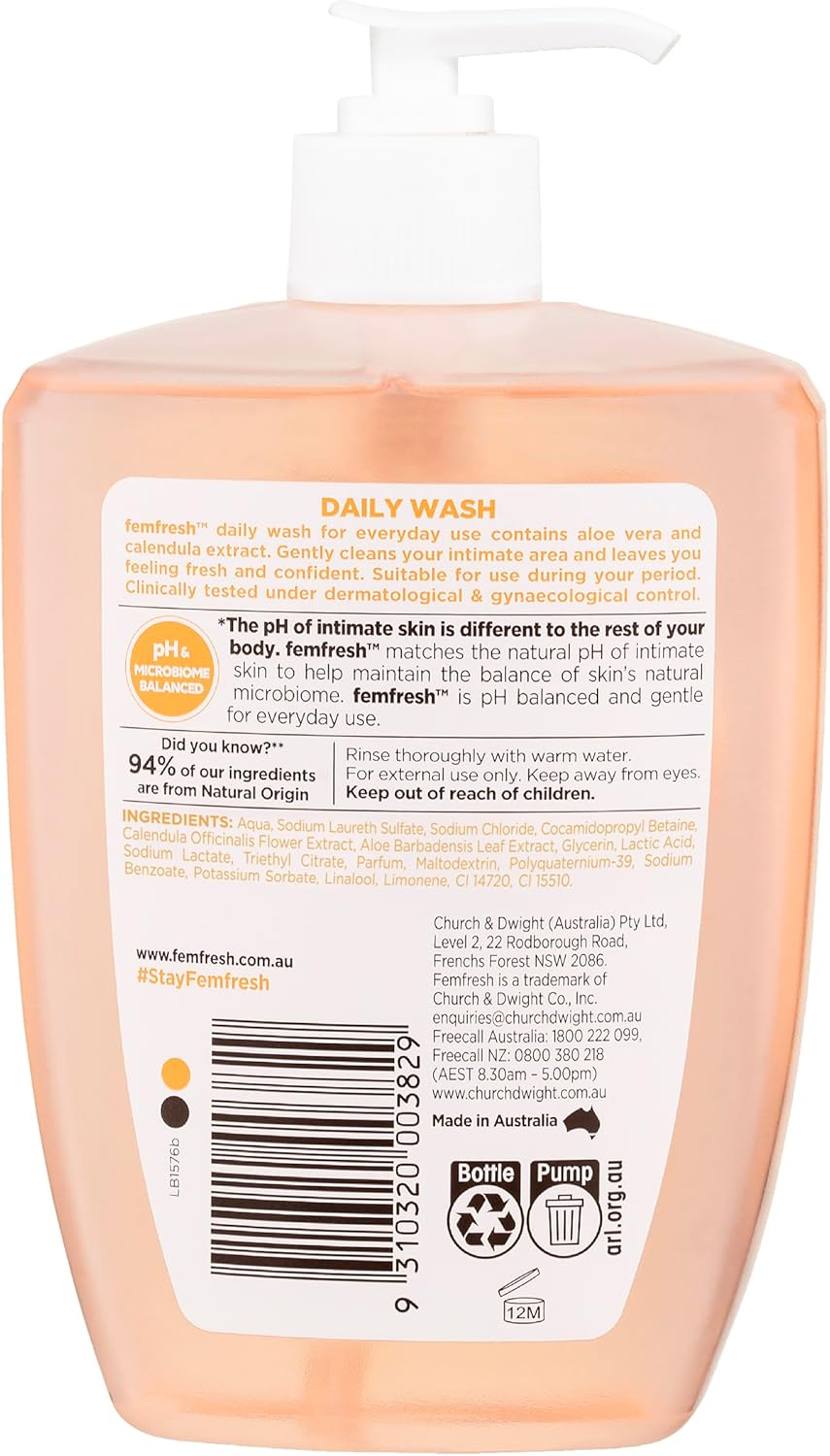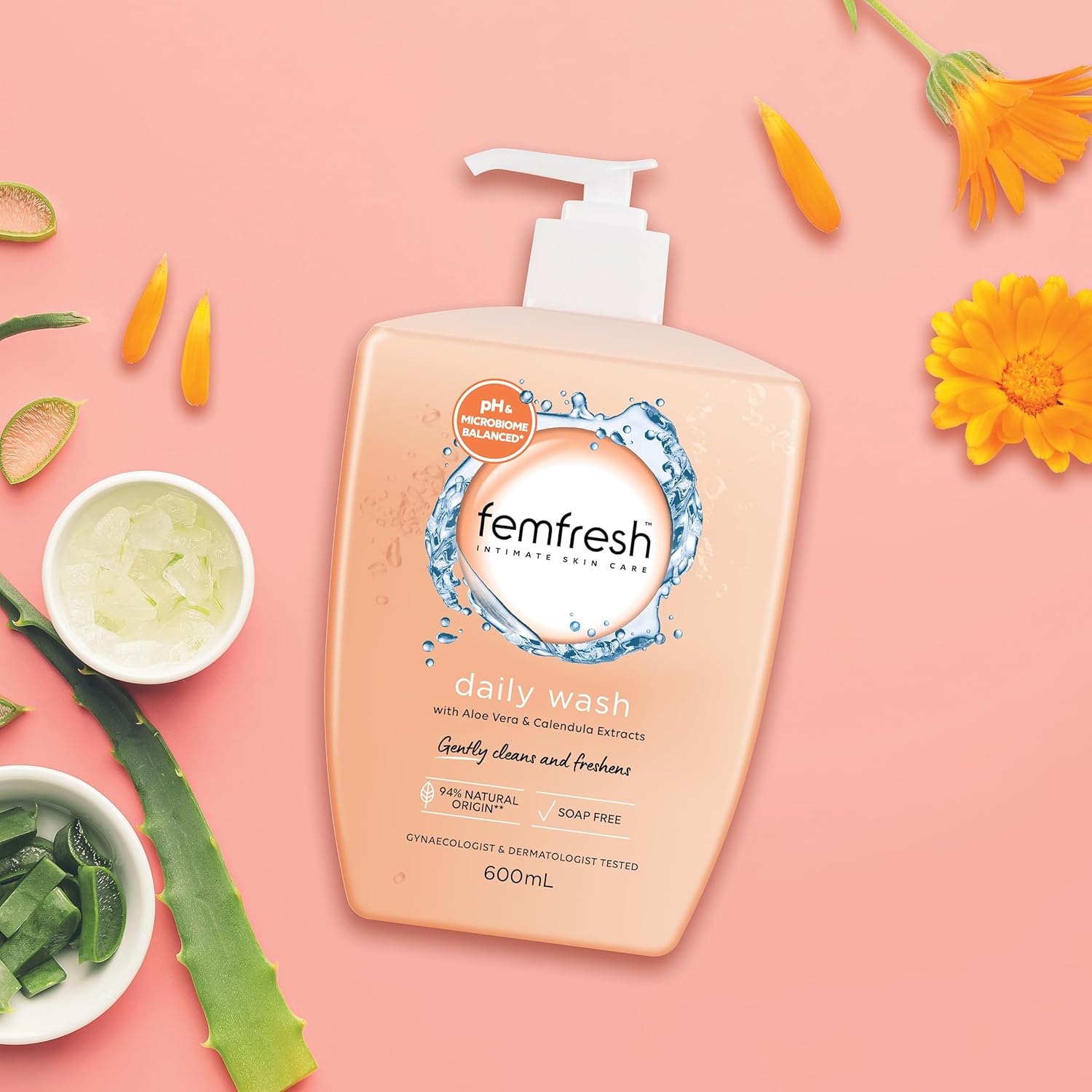 Femfresh Daily Intimate Wash 600ml – pH & Microbiome Balanced, With Aloe Vera & Calendula Extracts, 94% Natural Origin Ingredients, Hypoallergenic & Soap-Free, Gentle Feminine Wash for Freshness