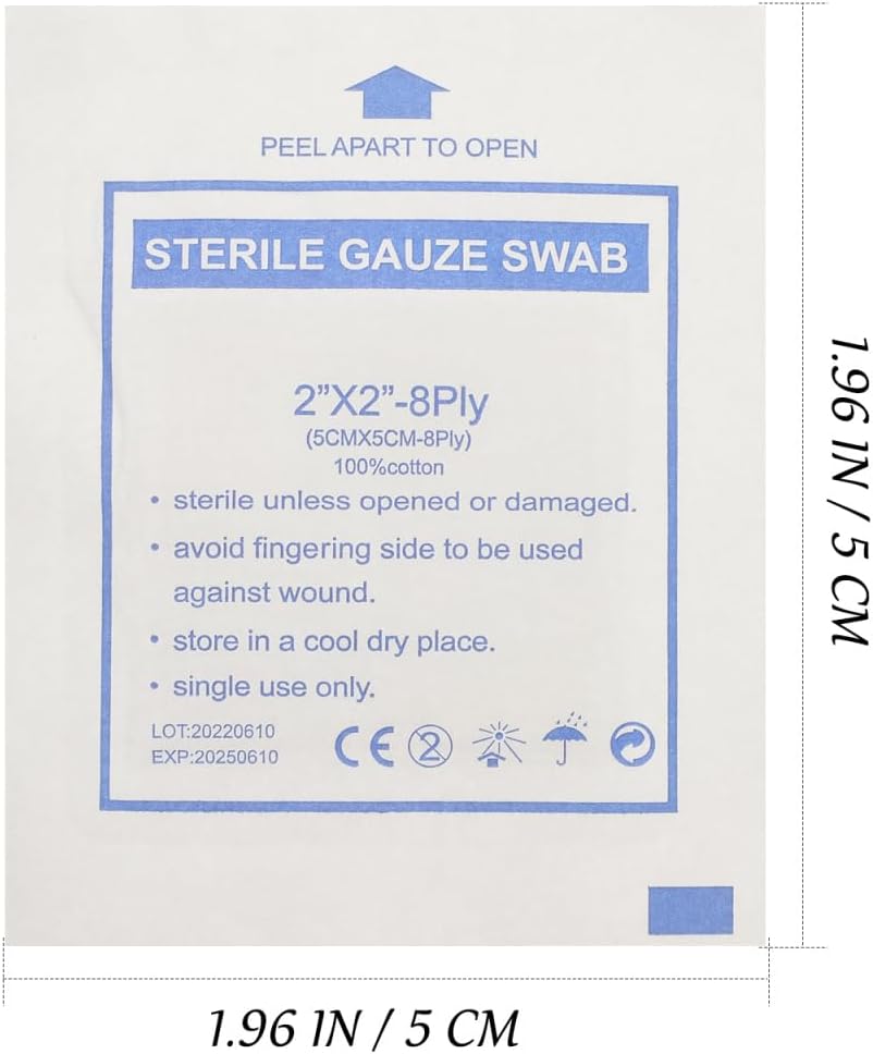 The Healeved gauze pads are 2x2 inches (5x5 cm) in size.