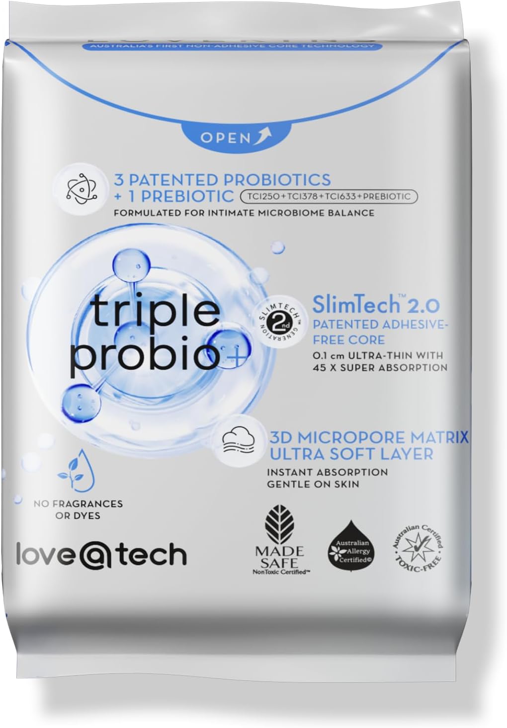 Discover superior comfort and protection with the Lovekins Triple ProBio Super Pads. These pads feature revolutionary SlimTech absorption technology, capable of holding up to 45 times their weight while maintaining a remarkably slim profile. They are specifically engineered for heavier flow days, incorporating a patented Triple ProBio formula that supports intimate wellness. The advanced glue-free core ensures maximum absorption without compromising comfort, and strategically placed breathable channels help maintain freshness throughout wear.