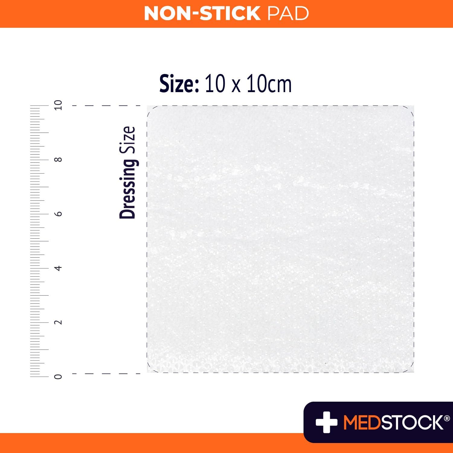 MEDSTOCK Non-Stick Pad, Gauze Pad Dressing, 10CM X 10CM, 100 Count, Non-Stick Wound Care, Surgical Grade, Fragile Tissue Protection, High Absorption, Porous Film Skin Contact Layer, Non Woven Fabric