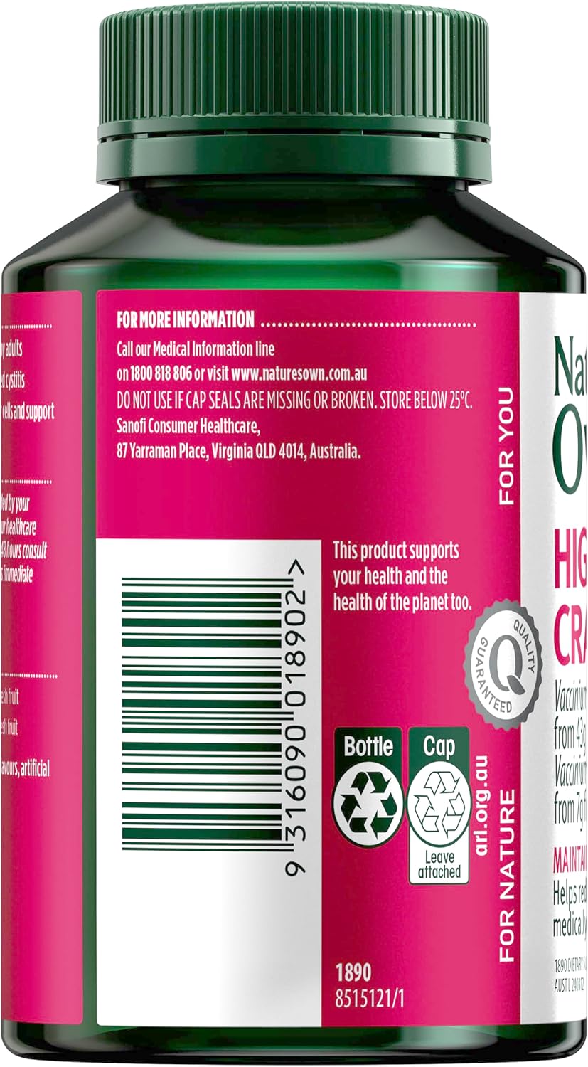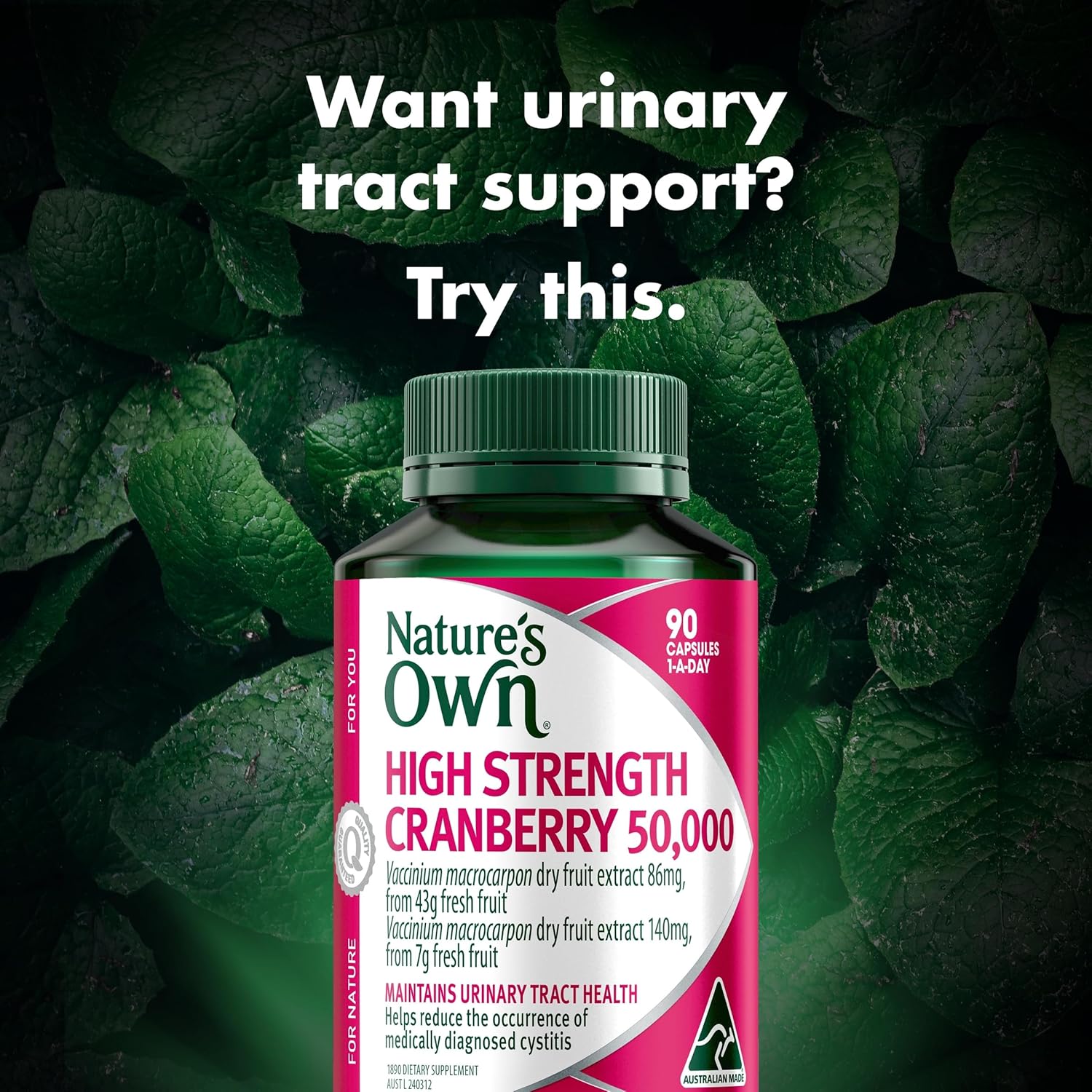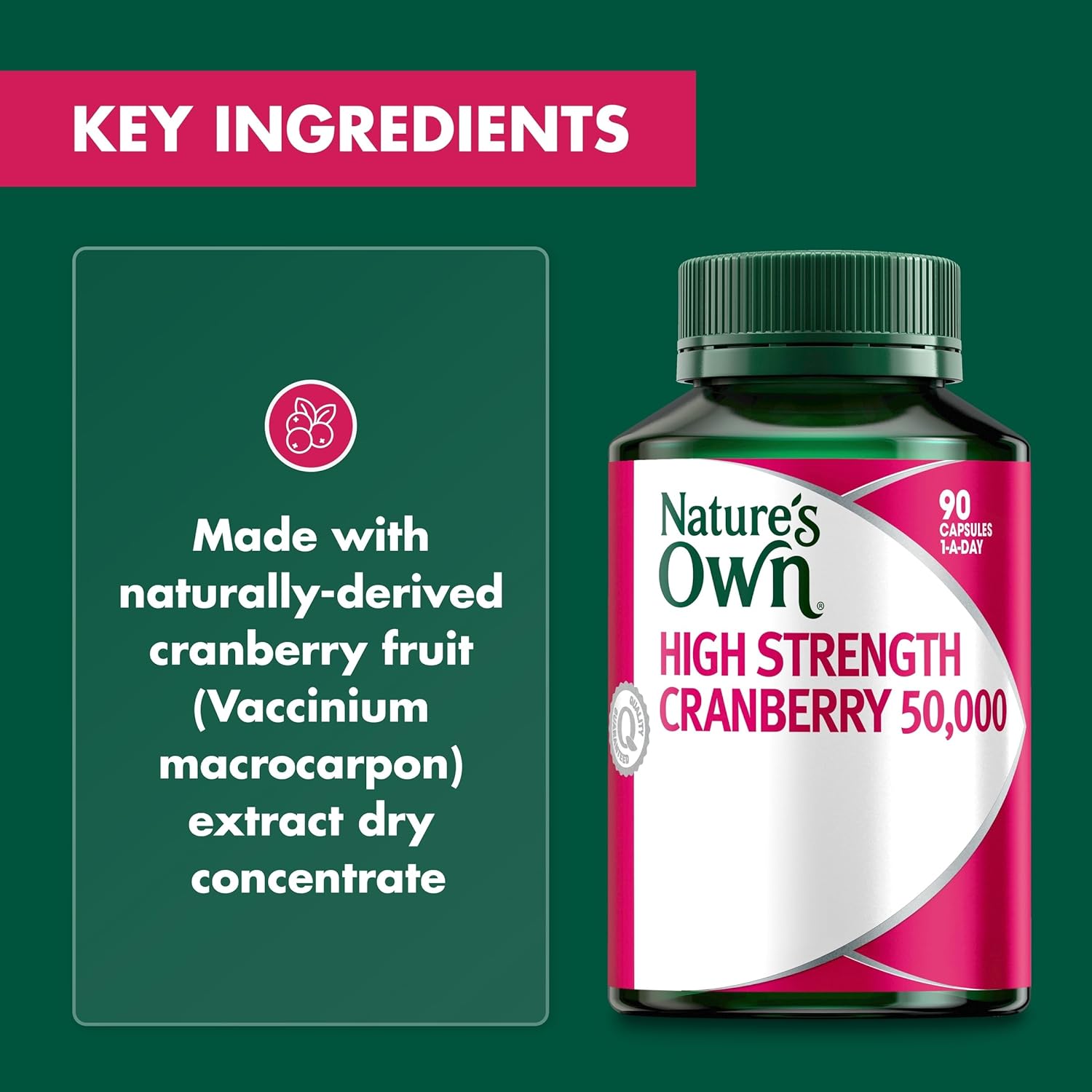 Nature's Own High Strength Cranberry 50,000 Capsules are designed to support urinary tract and kidney health. Made from naturally derived cranberry extract, these capsules help reduce free radical damage and promote oral health. Each bottle contains 90 capsules, with a recommended dosage of one capsule daily with food.