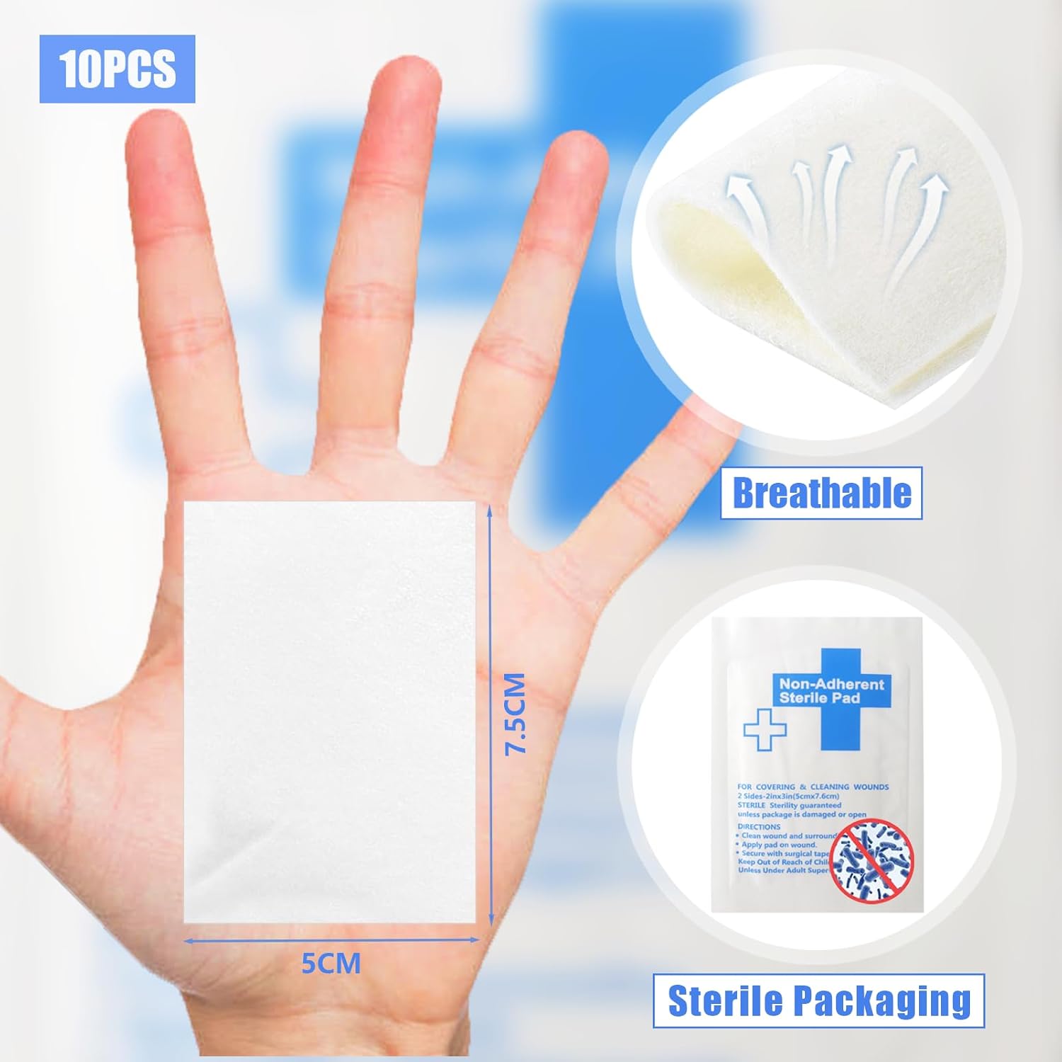 Non-Stick Wound Dressing Pads, 5 CM x 7.5 CM, Pack of 10, Sterile Highly Absorbent Wound Care Individually Wrapped Dressings