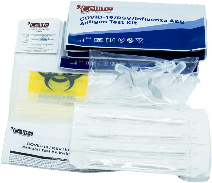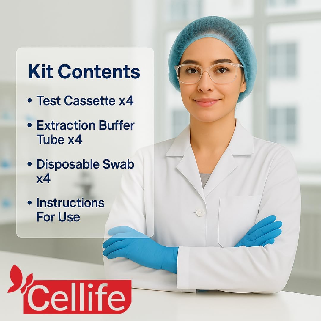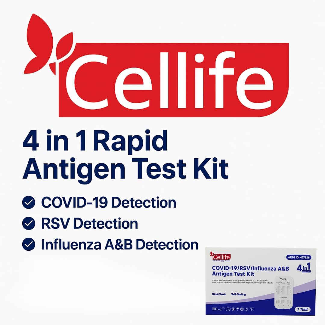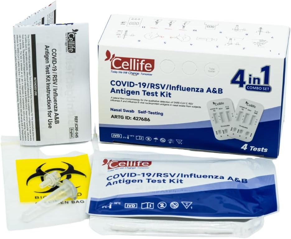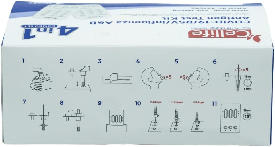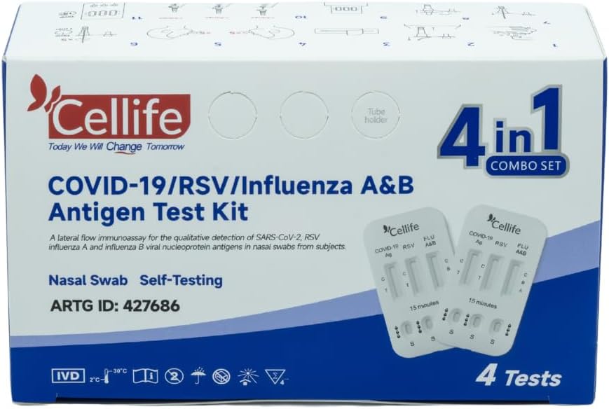 The Cellife Rapid Antigen Test (RAT) 4 in 1 Kit is designed for the quick detection of COVID-19, RSV, and Influenza A & B. This test uses a simple one-step process that allows individuals to perform self-testing at home. It is intended for adults aged 18 and older who exhibit symptoms of these infections within the first four days. The kit includes four tests, making it convenient for multiple uses or family testing.