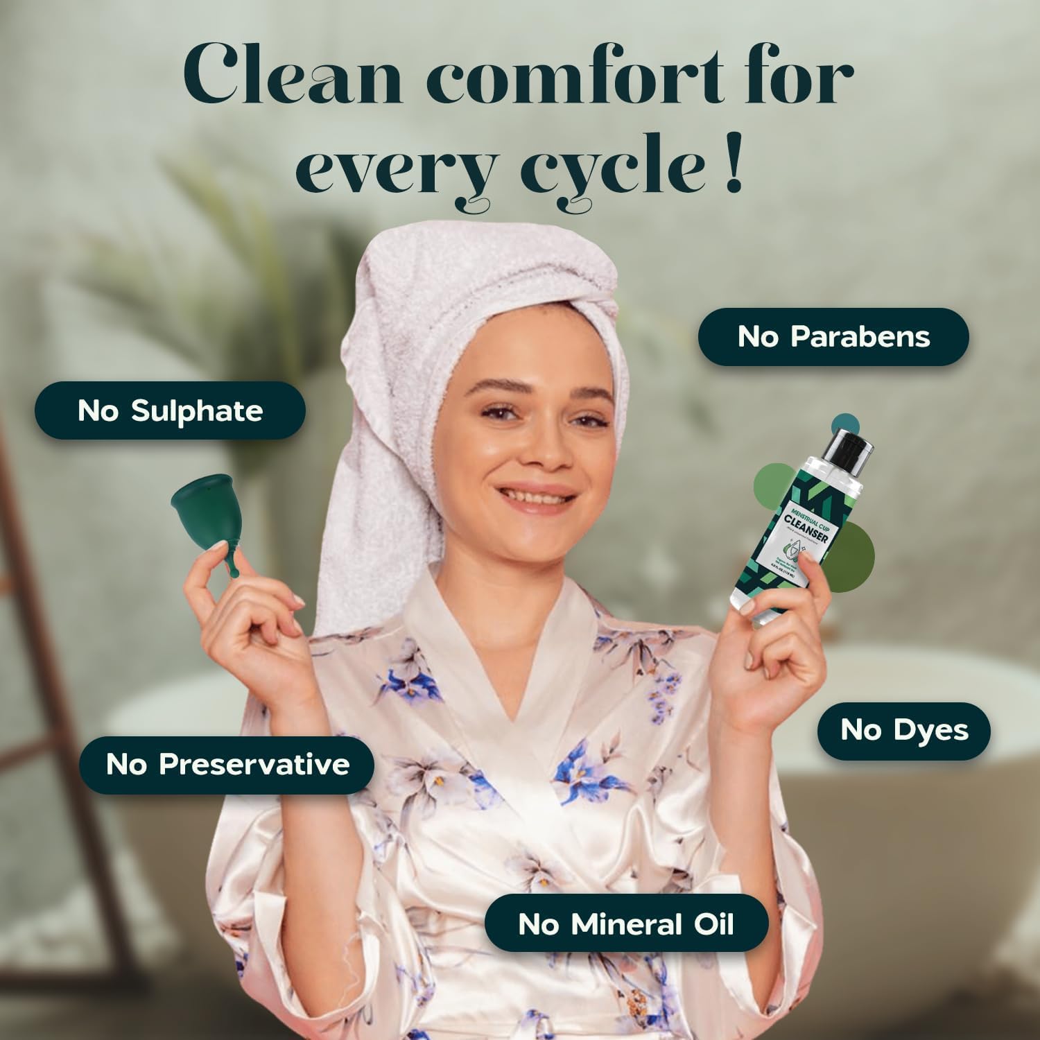 The kit includes a small and large silicone menstrual cup, a PH balanced gel cleaner wash, and a collapsible sterilizer cup.
