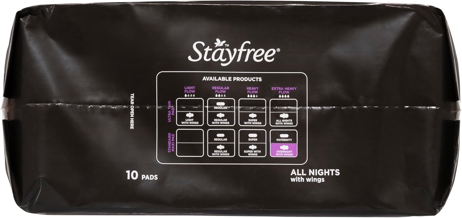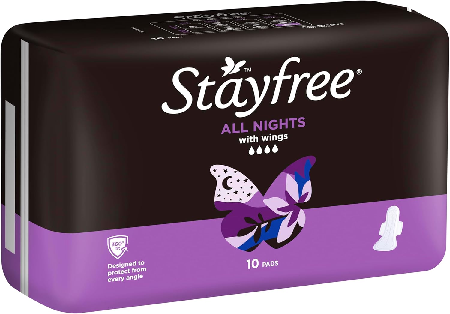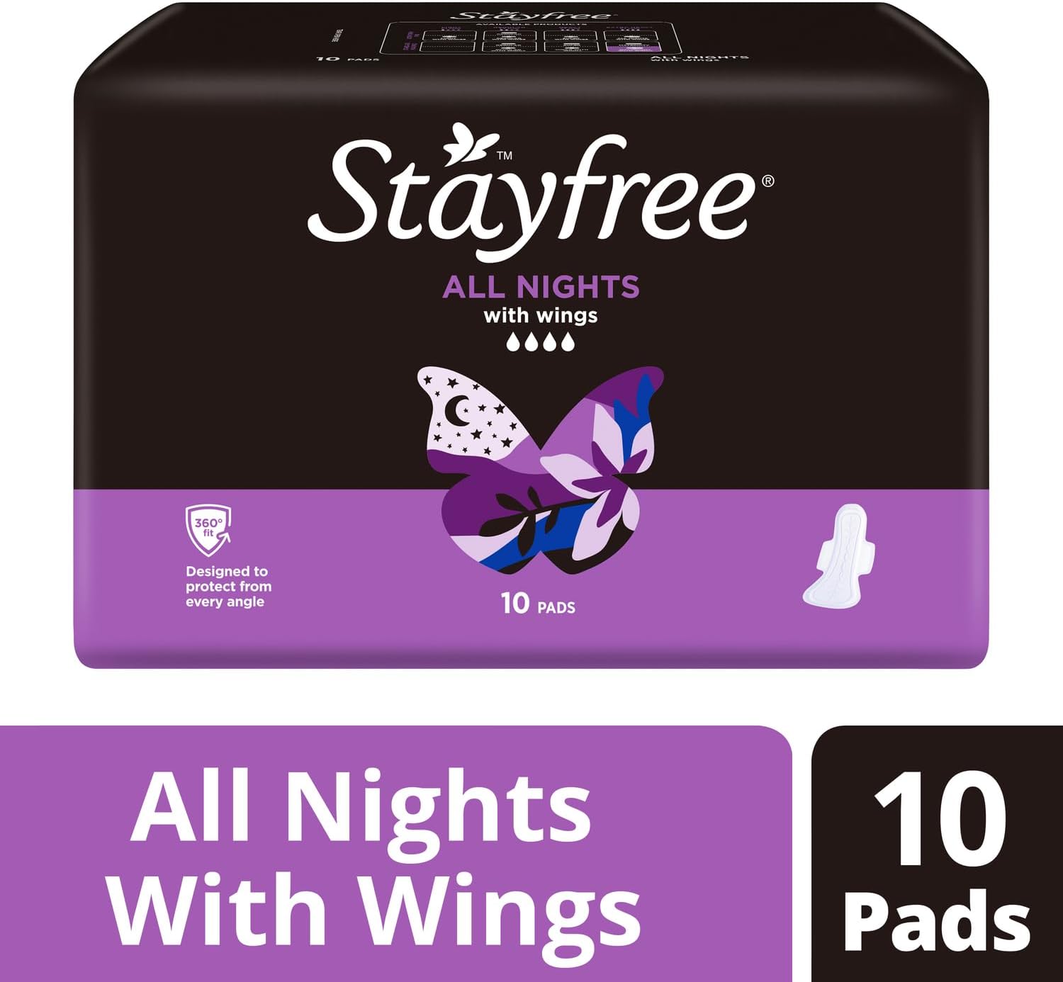 Stayfree All Nights Pads With Wings 10 Pack|Faster Absorption | Neutralises Odour|Cottony-Soft Quilted Cover| Keeps Dry and Comfortable