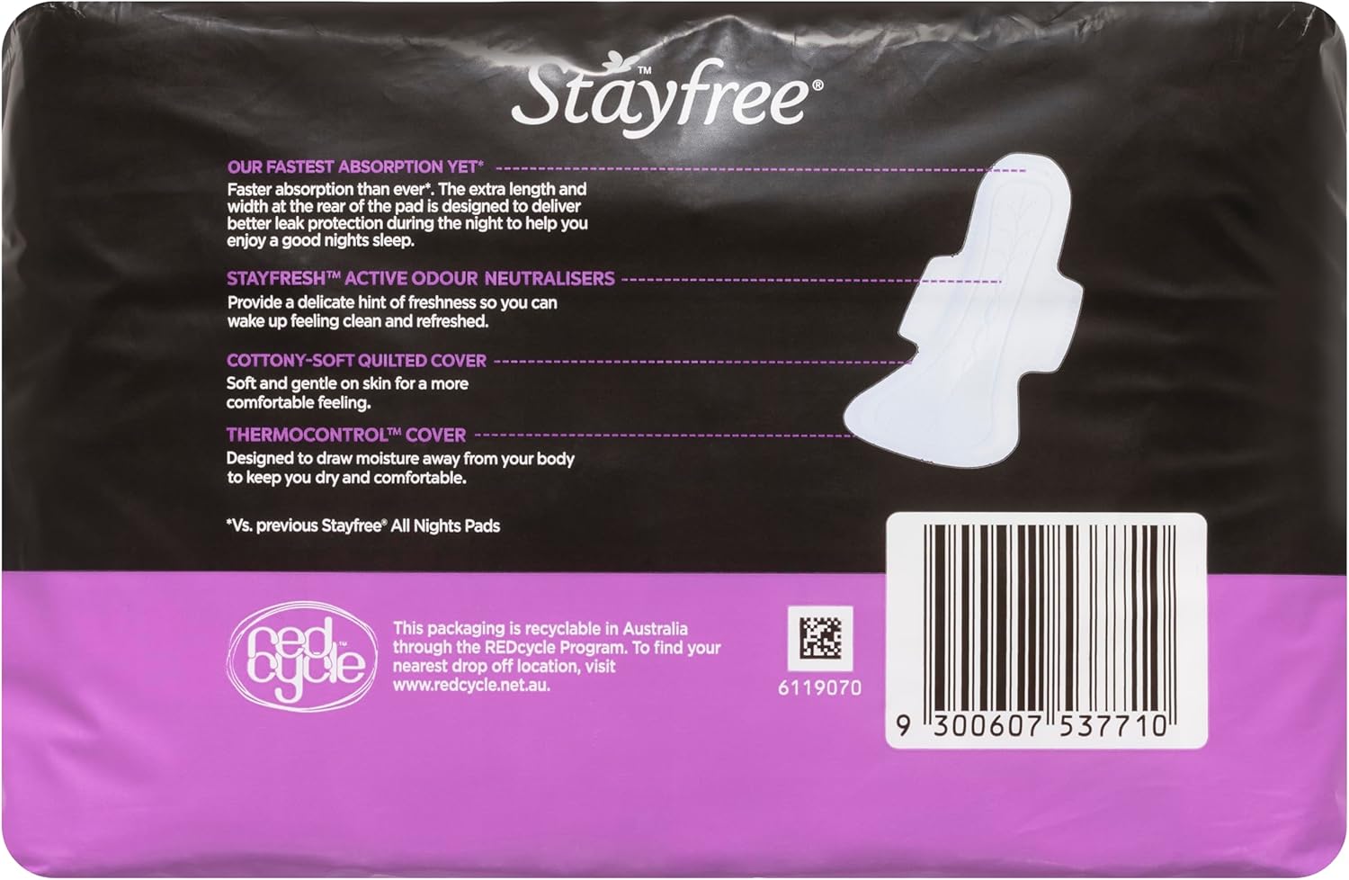 Stayfree All Nights Pads with Wings are designed for overnight comfort and protection. Featuring our fastest absorption technology, these pads ensure you stay dry throughout the night. The extra length and width at the rear provide enhanced leak protection, allowing you to enjoy a restful sleep. With Stayfresh active odour neutralisers, you can wake up feeling clean and refreshed. The cottony-soft quilted cover is gentle on your skin, making it comfortable to wear. Additionally, the thermocontrol cover helps draw moisture away from your body, keeping you dry and comfortable all night long.