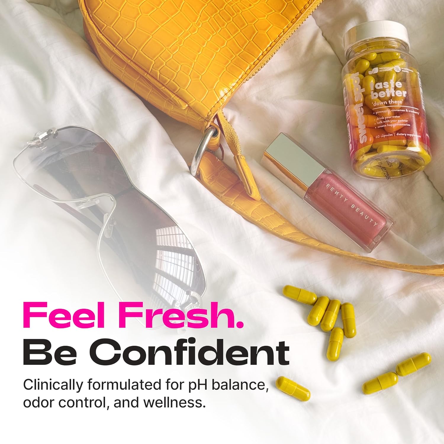 Sweet Spot Pineapple Extract Vaginal Probiotics are designed to enhance your taste and support vaginal health. Each bottle contains 30 capsules, and the recommended dosage is two capsules daily with water. This product aims to help you feel refreshed throughout the day. Key features include: