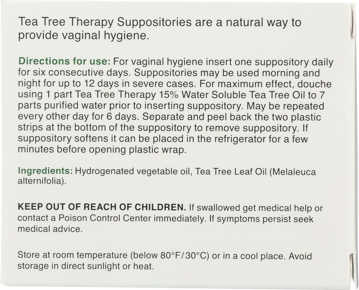 Tea Tree Therapy Vaginal Suppositories are designed to support vaginal hygiene with the natural benefits of tea tree oil. These suppositories are a simple addition to your routine, especially when seeking to restore balance to your body's natural defenses. They are not tested on animals, aligning with ethical standards for product testing.