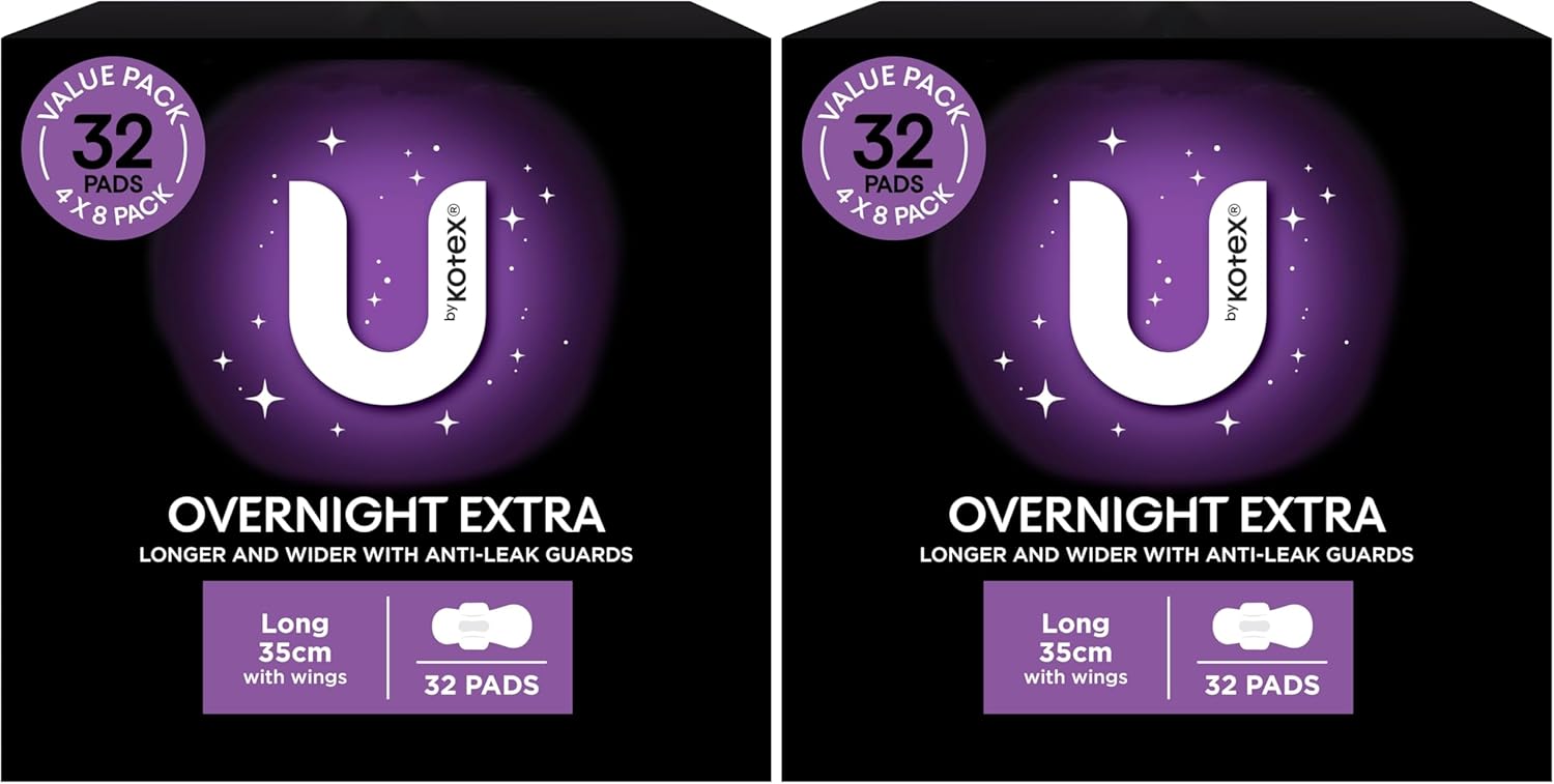 U by Kotex Extra Overnight Pads Long with Wings 64 Pack (4 x 8 Pack) – Packaging May Vary