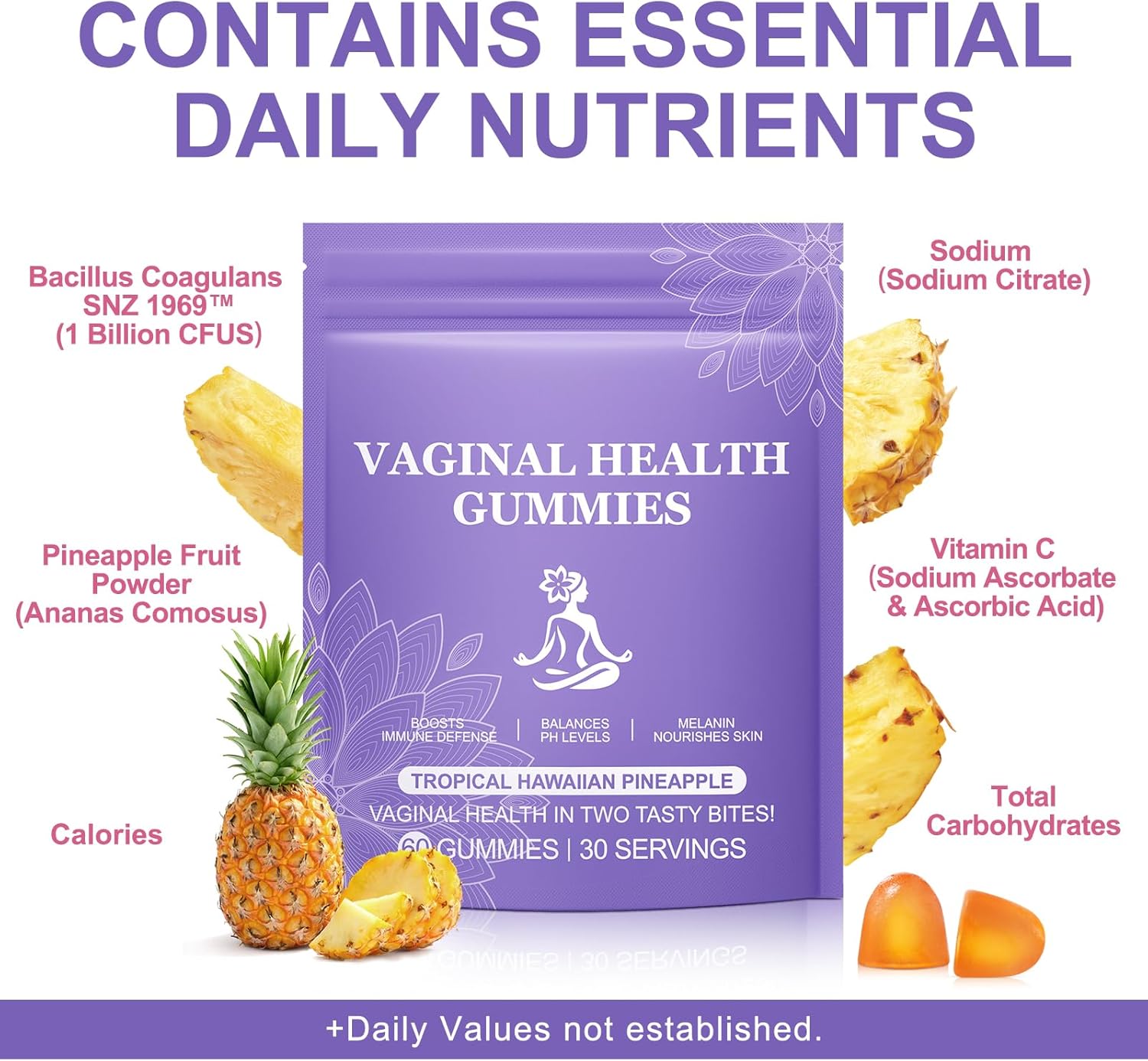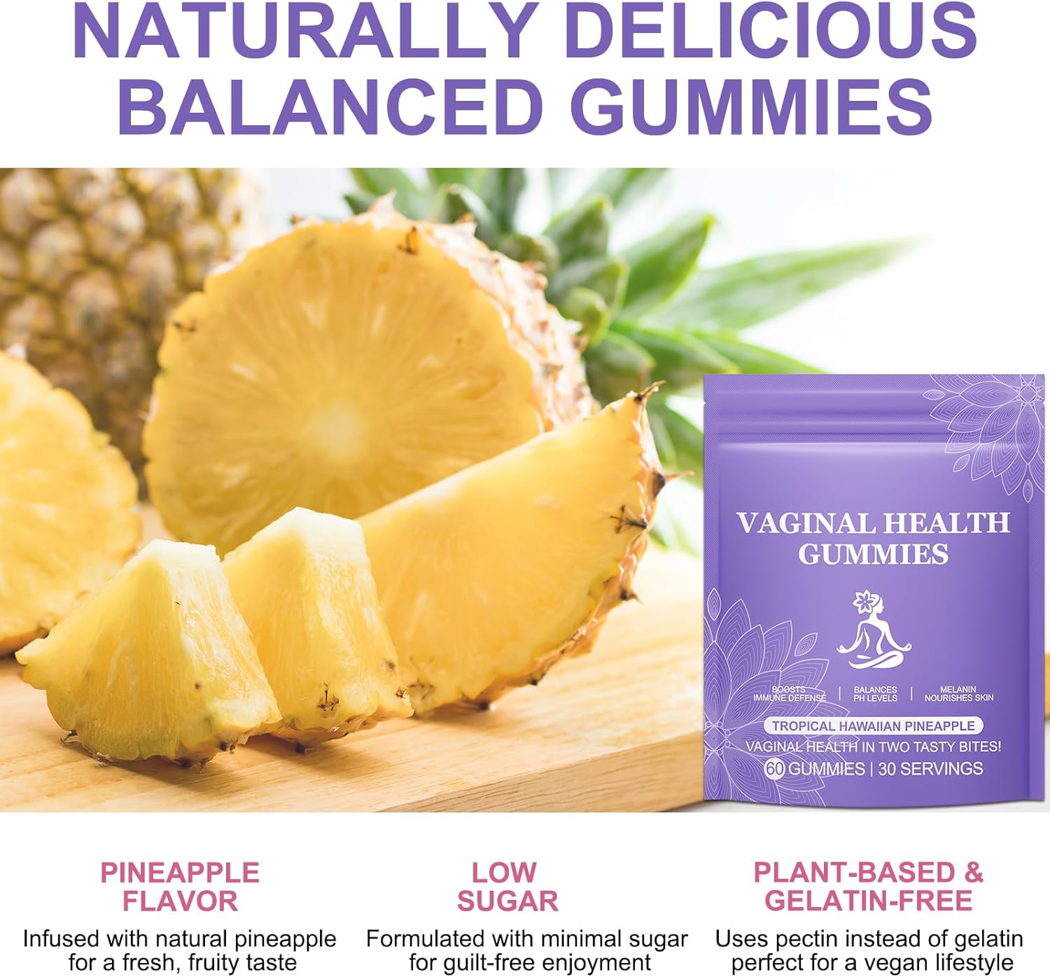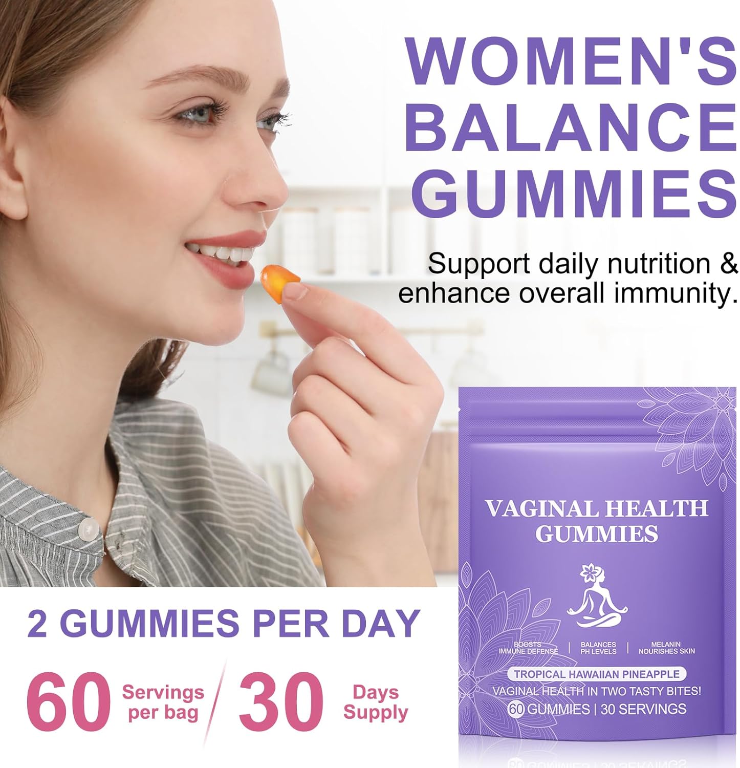 The Vaginal Probiotics for Women come in a convenient gummy form, making them easy to consume. These gummies are designed to support pH balance and promote vaginal health. Each bottle contains 60 gummies, providing a month’s supply for daily use. The product aims to improve immune function and maintain feminine balance, which can be beneficial for overall well-being.