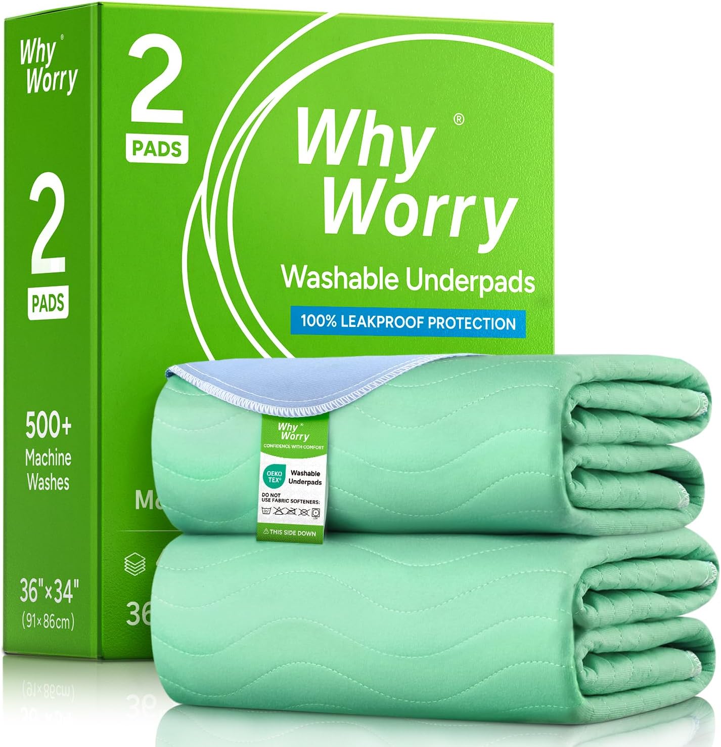 WhyWorry Washable Bed Pads for Adult Incontinence, 86x91cm (Pack of 2) Waterproof Mattress Protector for Bed Wetting, Heavy Absorbent Reusable Underpads for Elderly & Kids, Washable Pee Pads, Green