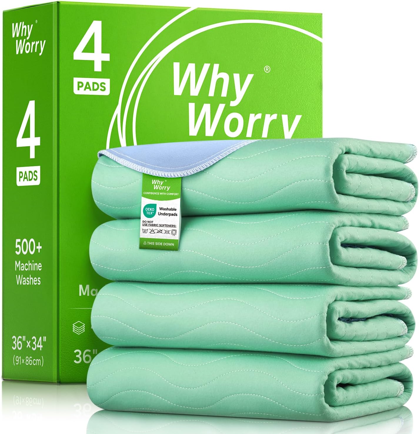 WhyWorry Washable Bed Pads for Adult Incontinence, 86x91cm (Pack of 4) Waterproof Mattress Protector for Bed Wetting, Heavy Absorbent Reusable Underpads for Elderly & Kids, Washable Pee Pads, Green