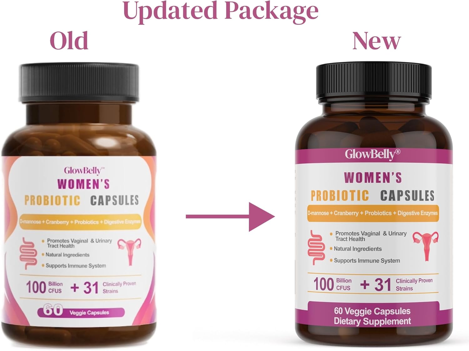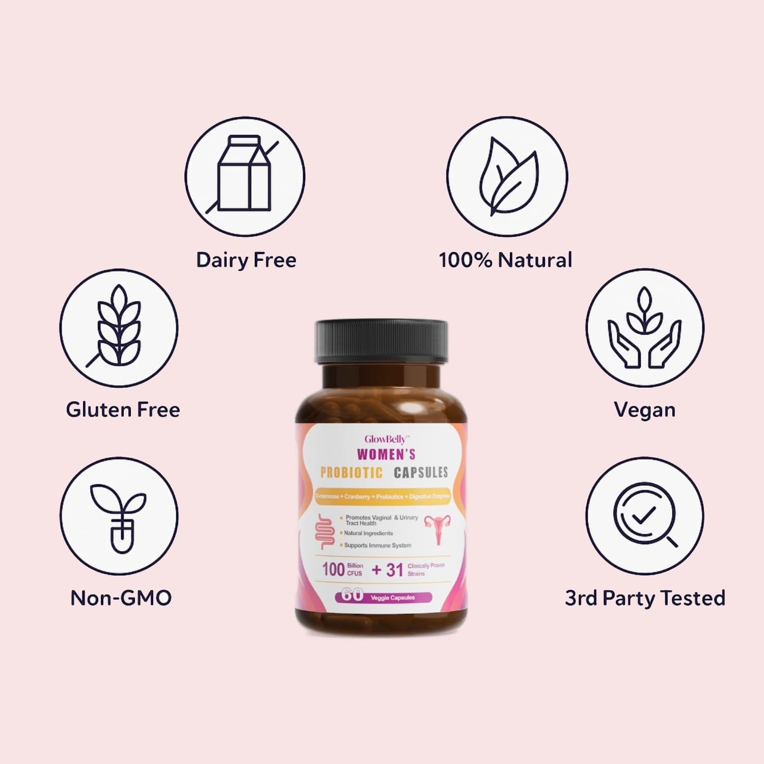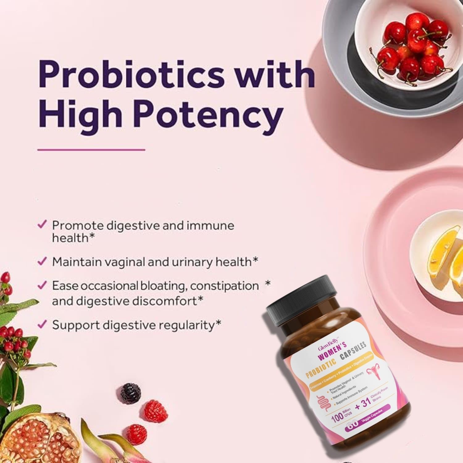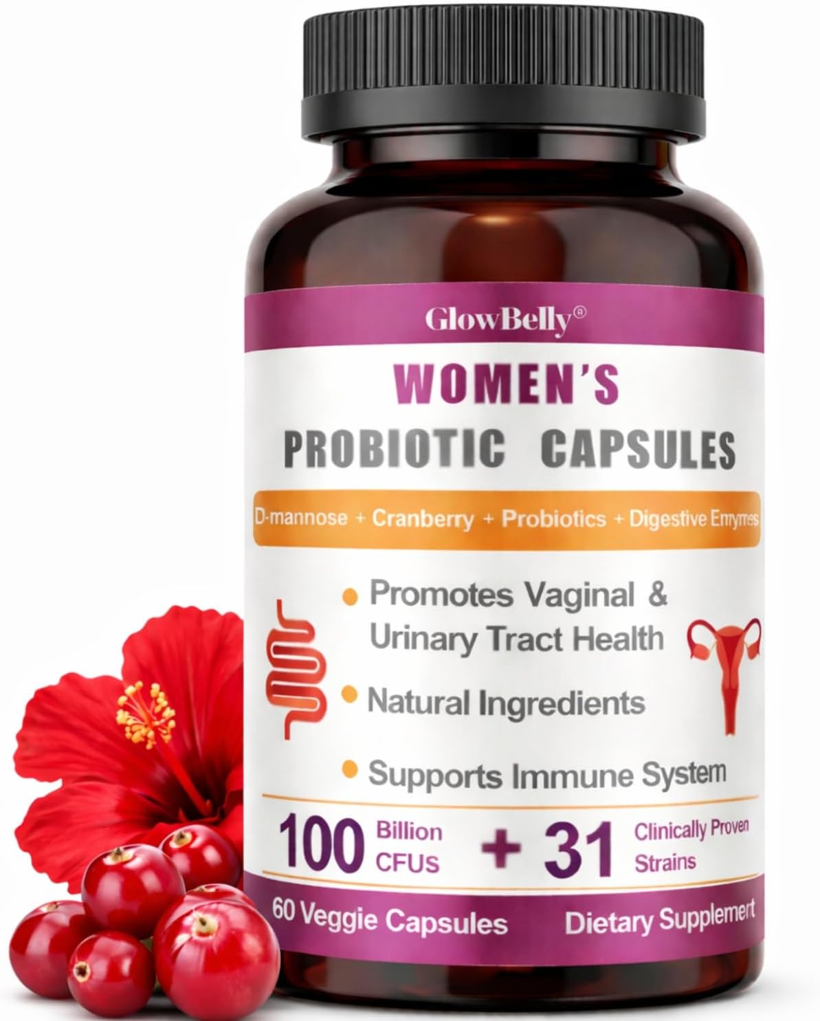 Women’s Probiotic + Vaginal & Urinary Tract Blend | 100 Billion CFU | 31 Strain Broad-Spectrum Blend with Prebiotics, Digestive Enzymes, Cranberry & D-Mannose | 60 Vegan Shelf-Stable Veggie capsules by GlowBelly